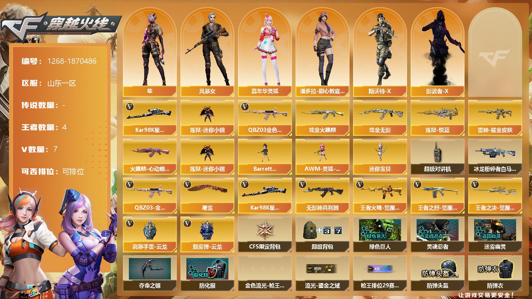 [15093198]山东一区-7V-4王者-2炫金 【热门武器】:QBZ03-金色蔷薇,Kar98K-星神,炼狱-迷你小钢 【王者炫金武器】:炼狱-悦蓝,炫金火麒麟,炫金无影 【皮肤】:雷神-耀金皮肤,火麒麟-心动糖果 【角色】:隼,风暴女,嘉年华灵狐,潘多拉-甜心教官,斯沃特-X,影武者-X 【人偶武器】:炼狱-迷你小钢,迷你宝贝,AWM-灵狐-15周年嘉年华,Barrett-夜玫瑰 【暴走生化】:超级对讲机