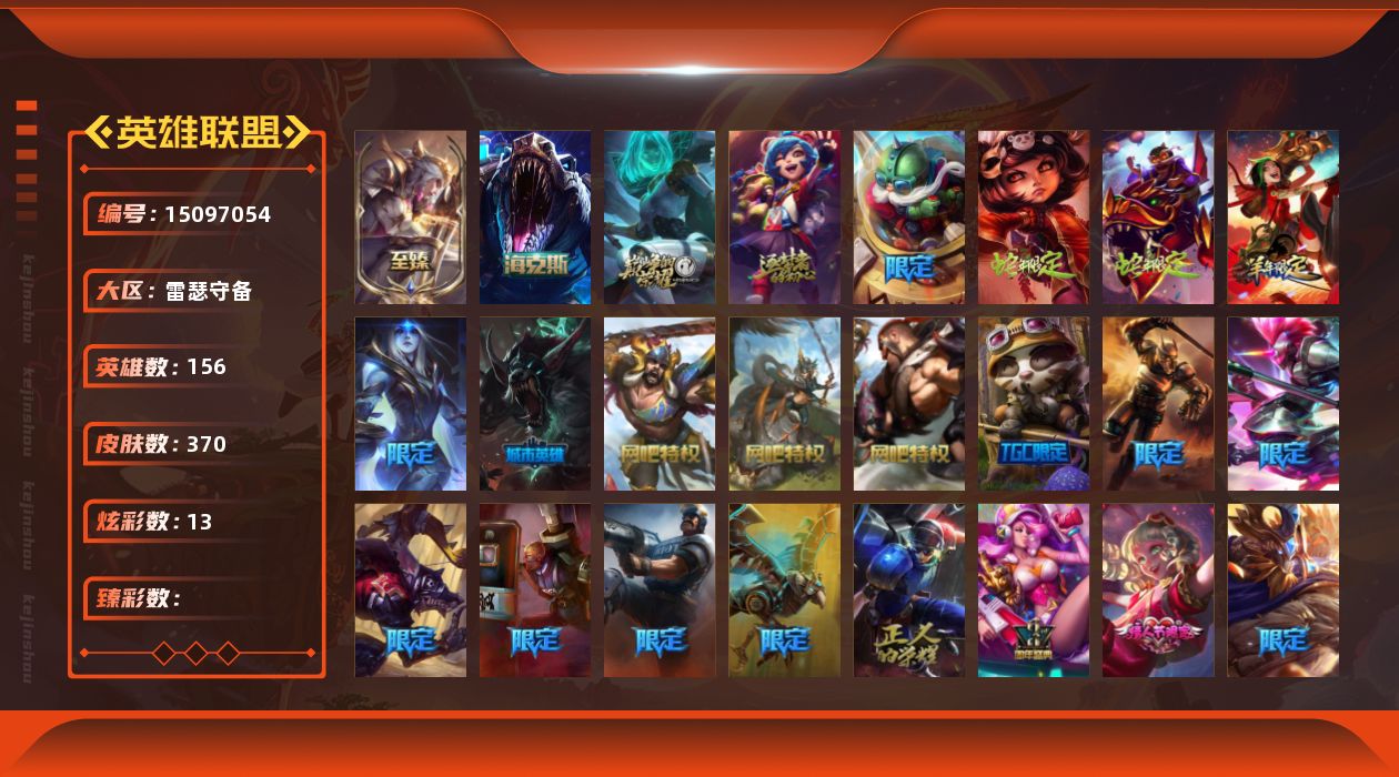 [15097054]可二次【店主推荐捡漏号!可直接换绑】 未定级段位-156英雄-370皮肤-13炫彩-0终极-4神话-47限定-36传说-105史诗
