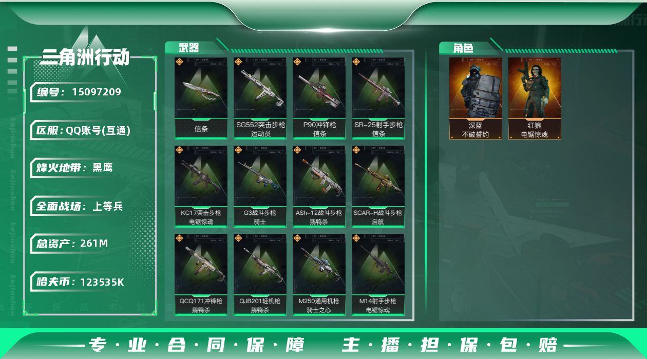 [15097209]【店主推荐捡漏号!可直接换绑】123535k哈伏币-244m流动资产-60烽火等级-黑鹰-24战场等级-上等兵 【干员外观】:深蓝-不破誓约,红狼-电锯惊魂 【近战皮肤】:近战-信条,近战-黑鹰 【传说外观】:M4A1突击步枪-阿米娅,ASh-12战斗步枪-鹅鸭杀,M16A4突击步枪-狩猎时刻,SG552突击步枪-运动员,SCAR-H战斗步枪-启航,G3战斗步枪-狩猎时刻,G3战斗步枪-骑士,CAR-15突击步枪-阿米娅,腾龙突击步枪-捞点薯条,KC17突击步枪-电锯惊魂,P90冲锋枪-信条,Vector冲锋枪-狩猎时刻,Vector冲锋枪-能天使-午夜邮差,勇士冲锋枪-能天使-午夜邮差,QCQ171冲锋枪-鹅鸭杀,M250通用机枪-骑士之心,QJB201轻机枪-鹅鸭杀,M14射手步枪-电锯惊魂,SR-25射手步枪-信条,AWM狙击步枪-捞点薯条,93R-捞点薯条,复合弓-黑·天际线 【史诗外观】:ASh-12战斗步枪-无极限,M16A4突击步枪-竞赛选手,AUG突击步枪-蝮蛇,SCAR-H战斗步枪-囚徒,G3战斗步枪-流沙送葬,AS Val突击步枪-百步穿杨,腾龙突击步枪-猎鳄行动,K437突击步枪-守护者,MP5冲锋枪-战术竞备,MP5冲锋枪-竞技风,Vector冲锋枪-异域战争,SR-3M紧凑突击步枪-战术竞备,勇士冲锋枪-深海恐惧,勇士冲锋枪-工业狂潮,MP7冲锋枪-守护者,PKM通用机枪-蝮蛇,Mini-14射手步枪-守护者,SV-98狙击步枪-林中猎手,AWM狙击步枪-无极限,复合弓-守护者 【稀有外观】:SV-98狙击步枪-花岗岩,QCQ171冲锋枪-地平线,R93狙击步枪-地平线,AKM突击步枪-战术演练,AKM突击步枪-肃杀,QBZ95-1突击步枪-公平竞技,ASh-12战斗步枪-繁盛,AUG突击步枪-指挥官,M7战斗步枪-前沿科技,M7战斗步枪-捣蛋鬼,SCAR-H战斗步枪-荣耀列队,SCAR-H战斗步枪-黄昏,G3战斗步枪-战术演练,G3战斗步枪-主宰,腾龙突击步枪-冰天雪地,MP5冲锋枪-弄臣,MP5冲锋枪-虎啸,MP5冲锋枪-哈夫克卫队,P90冲锋枪-黄昏,P90冲锋枪-捣蛋鬼,Vector冲锋枪-先锋,UZI冲锋枪-亚特兰蒂斯,SMG-45-行动开启,SMG-45冲锋枪-幻影结构,勇士冲锋枪-主宰,勇士冲锋枪-冰天雪地,MP7冲锋枪-钢