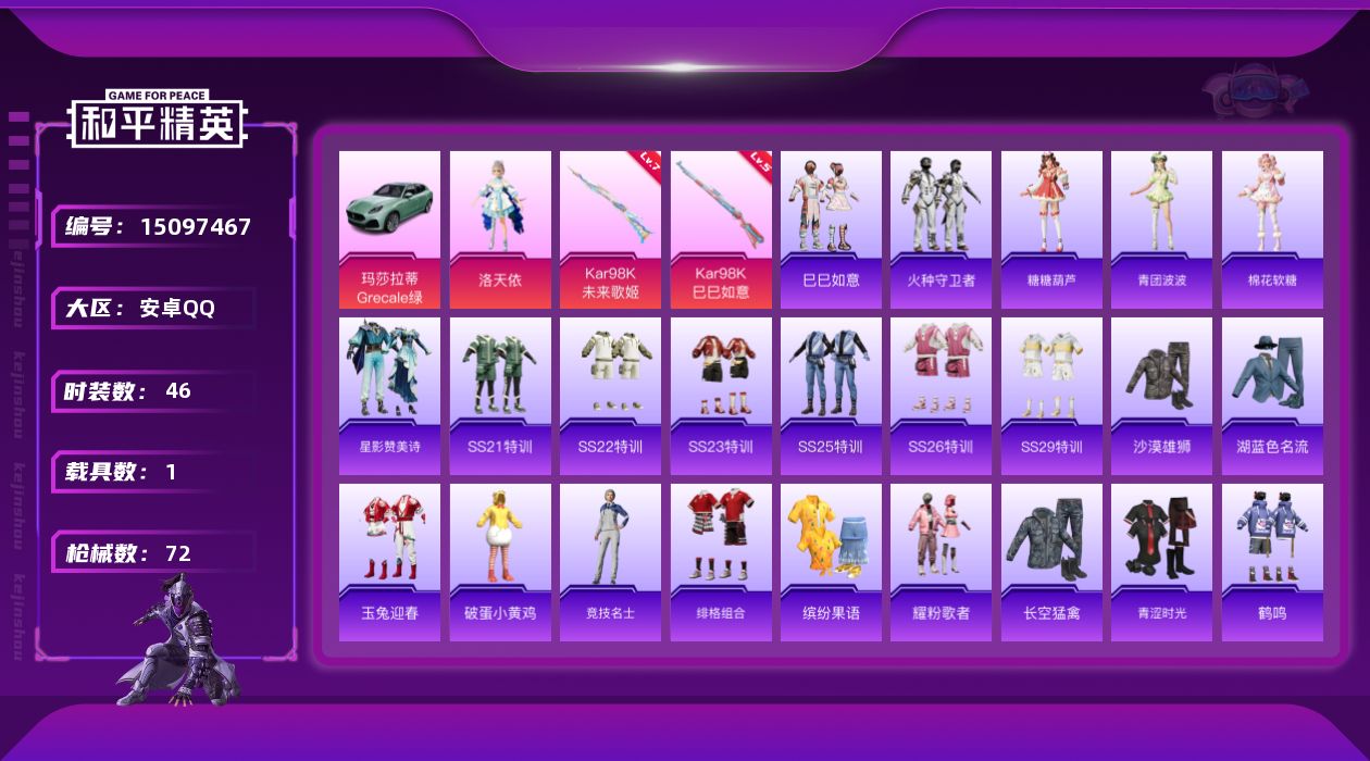 [15097467]不可二次【店主推荐捡漏号!可直接换绑】/地铁满天赋 安卓 手Q-1粉装-2特效枪-1载具-2.4w热力值-2王牌印记-46套装-72枪皮【粉色载具】:玛莎拉蒂Grecale(薄荷绿)【粉色套装】:角色-洛天依【粉色枪皮等级】:Kar98K-未来歌姬(七级),Kar98K-巳巳如意(五级)
