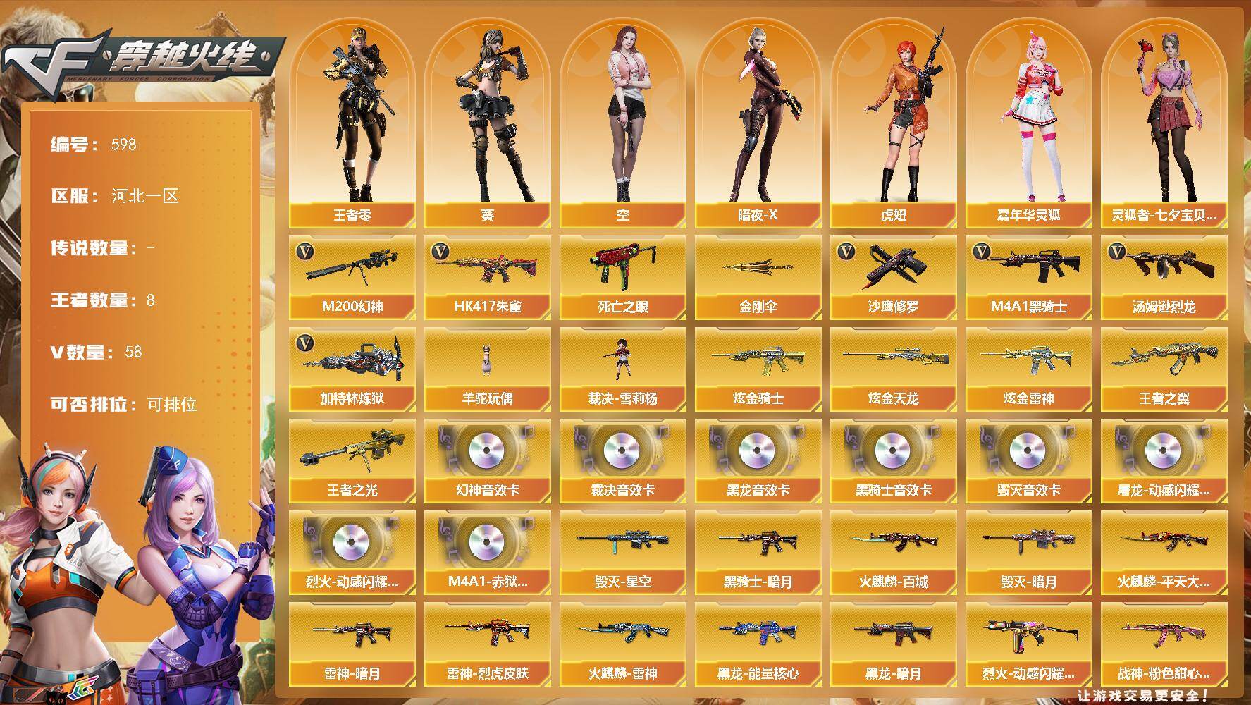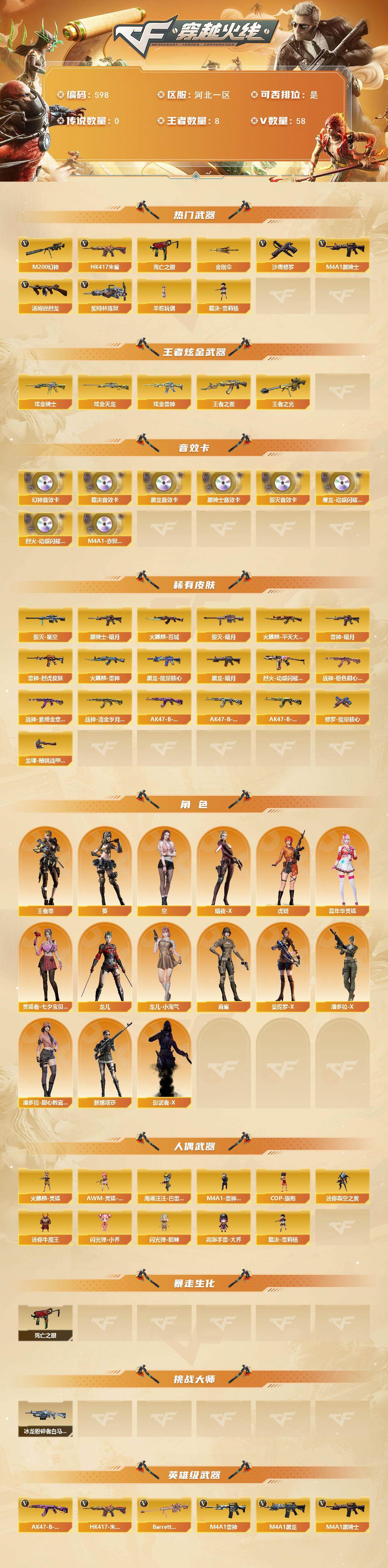 [15099101]河北一区-58V-8王者-5炫金 【热门武器】:HK417-朱雀,M200-幻神,死亡之眼,M4A1-黑骑士,汤姆逊-烈龙*2,加特林-炼狱,羊驼玩偶,裁决-雪莉杨,沙鹰-修罗*4,金刚伞 【王者炫金武器】:王者之翼,王者之光,炫金骑士*3,炫金雷神,炫金天龙 【音效卡】:屠龙-动感闪耀 音效卡,烈火-动感闪耀 音效卡,M200-幻神音效卡,M4A1-黑龙音效卡,M4A1-黑骑士音效卡,Barrett-毁灭音效卡,AWM-裁决音效卡,M4A1-赤狱骑士-怀旧音效卡 【皮肤】:雷神-暗月,雷神-烈虎皮肤,火麒麟-雷神,火麒麟-平天大圣,火麒麟-百城,毁灭-暗月,毁灭-星空,黑龙-能量核心,黑龙-暗月*2,黑骑士-暗月,烈火-动感闪耀 皮肤,战神-粉色甜心皮肤,战神-紫绶金章皮肤,战神-流金岁月皮肤,AK47-B-常胜将军-曹操,AK47-B-常胜将军-刘备,AK47-B-常胜将军-孙权*2,修罗-能量核心*2,龙啸-黯钢战甲 皮肤 【角色】:葵,王者-零,空,暗夜-X,虎妞,嘉年华灵狐,灵狐者-七夕宝贝,龙儿,龙儿-小淘气,麻雀,曼陀罗-X,潘多拉-X,潘多拉-甜心教官,新娜塔莎,影武者-X 【人偶武器】:裁决-雪莉杨,火麒麟-灵狐*3,M4A1-雷神-精英刀锋,AWM-灵狐-15周年嘉年华,海滩汪汪-巴雷特,COP-旗袍,迷你裂空之翼,迷你牛魔王,闪光弹-小乔,闪光弹-貂蝉,高爆手雷-大乔 【暴走生化】:死亡之眼 【挑战大师】:冰龙粉碎者-白马银枪 【英雄级武器】:M4A1-千变,AK47-火麒麟,M4A1-黑龙*2,M4A1-雷神*2,M4A1-黑骑士,AK47-无影,M4A1-死神,AK47-黑武士,AN94-超新星,M4A1-雷霆,HK417-朱雀,无影-神兵利器,AK-47-猩红传说,AK47-B-战神,AK47-B-常胜将军,Barrett-毁灭*2,AWM-裁决,M200-幻神,Barrett-金色蔷薇,王者之怒-觉醒版,王者之光-觉醒版,王者之力-觉醒版,加特林-炼狱,汤姆逊-烈龙*2,AA-12-雷霆,沙鹰-修罗*4,沙鹰-天神,屠龙*3,龙啸,擎天,麒麟刺*4,王者之击-觉醒版*2,高爆手雷-雷霆,高爆手雷-幻灵,闪光弹-雷霆,闪光弹-幻灵,闪光弹-竞技荣光,闪光弹-雷霆王者-觉醒版,烟雾弹-雷霆,烟雾弹-幻灵,烟雾弹-竞技荣光 【道具】:战舰背