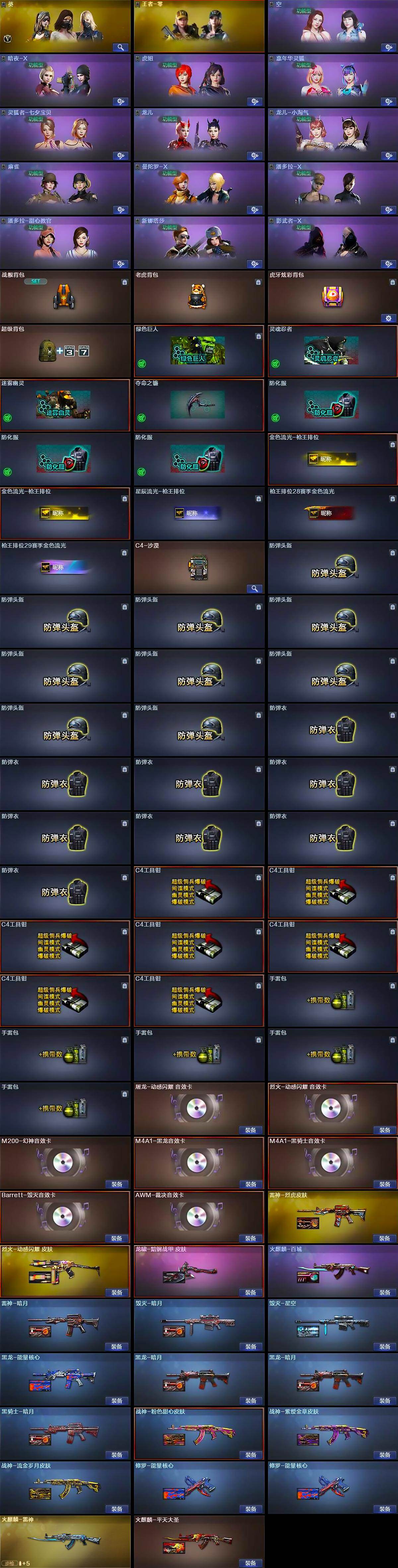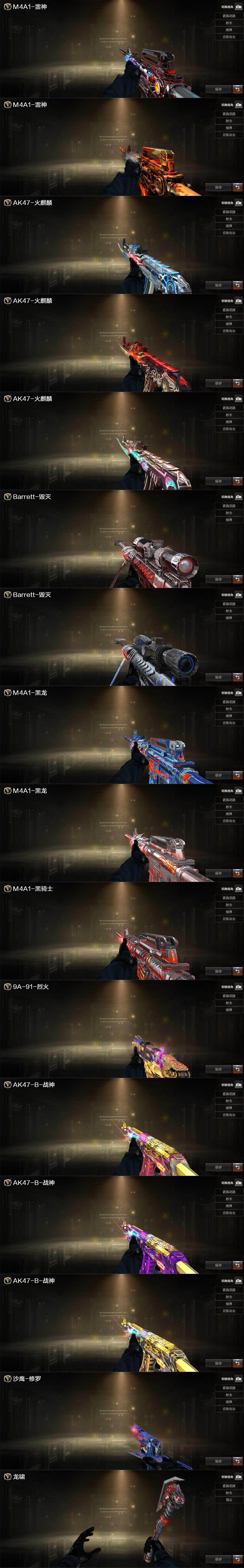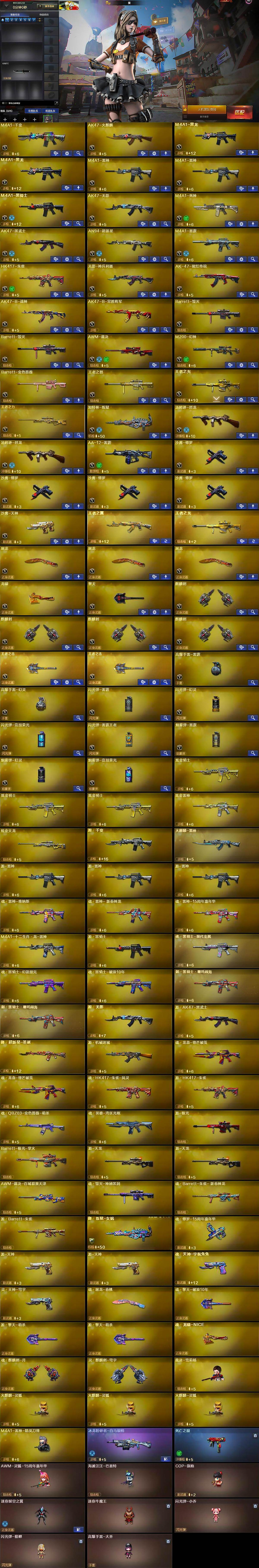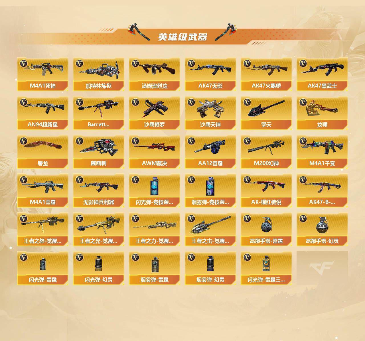 【英雄级武器】:M4A1-千变,AK47-火麒麟,M4A1-黑龙*2,M4A1-雷神*2,M4A1-黑骑士,AK47-无影,M4A1-死神,AK47-黑武士,AN94-超新星,M4A1-雷霆,HK417-朱雀,无影-神兵利器,AK-47-猩红传说,AK47-B-战神,AK47-B-常胜将军,Barrett-毁灭*2,AWM-裁决,M200-幻神,Barrett-金色蔷薇,王者之怒-觉醒版,王者之光-觉醒版,王者之力-觉醒版,加特林-炼狱,汤姆逊-烈龙*2,AA-12-雷霆,沙鹰-修罗*4,沙鹰-天神,屠龙*3,龙啸,擎天,麒麟刺*4,王者之击-觉醒版*2,高爆手雷-雷霆,高爆手雷-幻灵,闪光弹-雷霆,闪光弹-幻灵,闪光弹-竞技荣光,闪光弹-雷霆王者-觉醒版,烟雾弹-雷霆,烟雾弹-幻灵,烟雾弹-竞技荣光