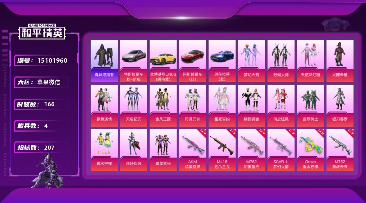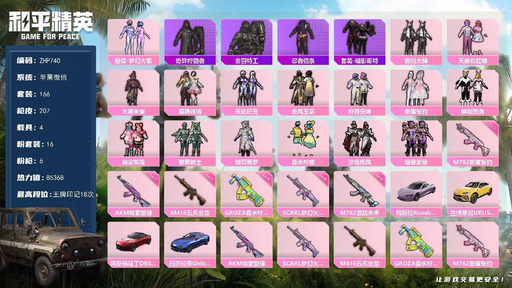 [15101960]苹果 微信-16粉装-6特效枪-4载具-5粉色飞行器-85368热力值-18王牌印记-166套装-207枪皮