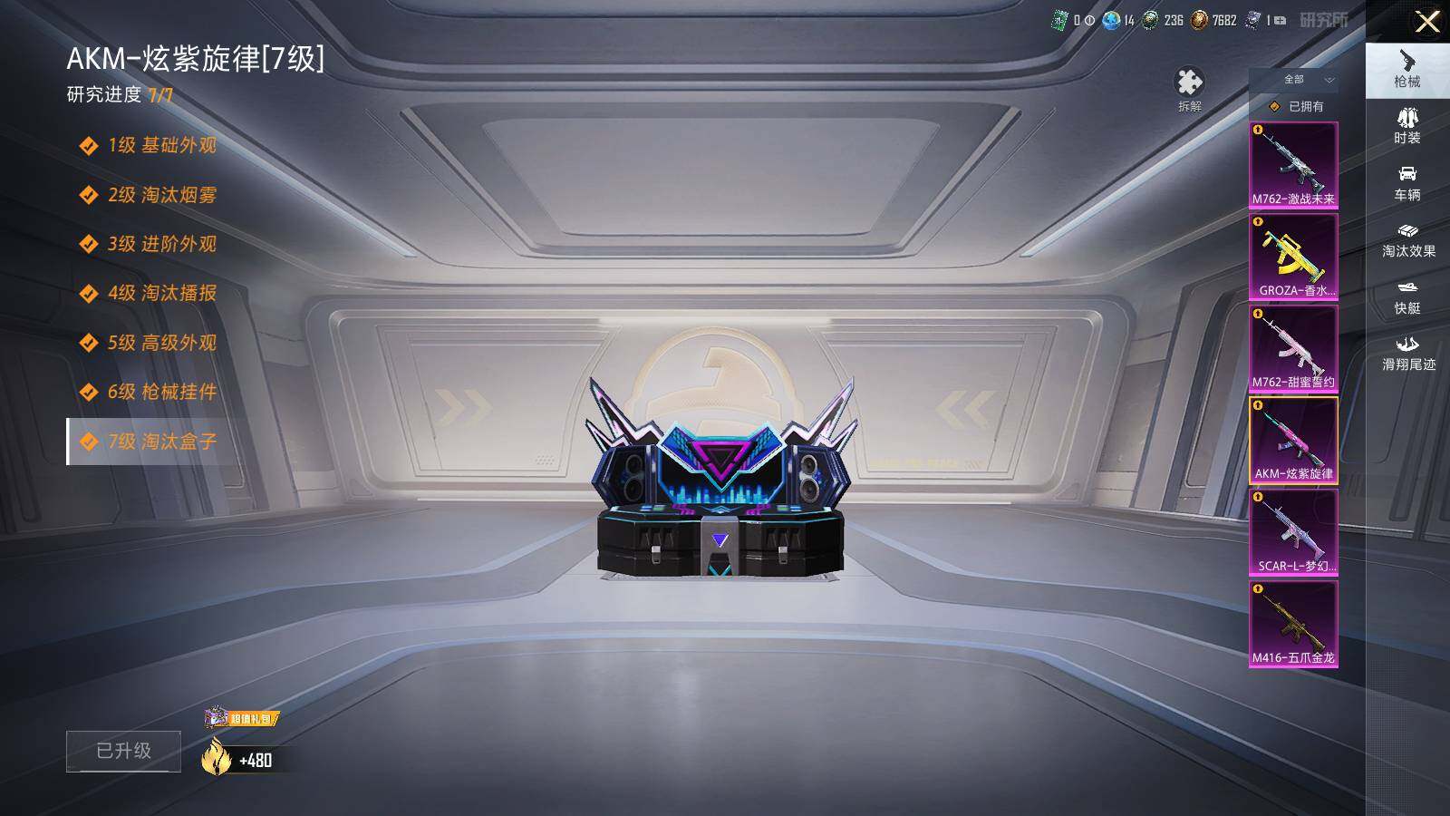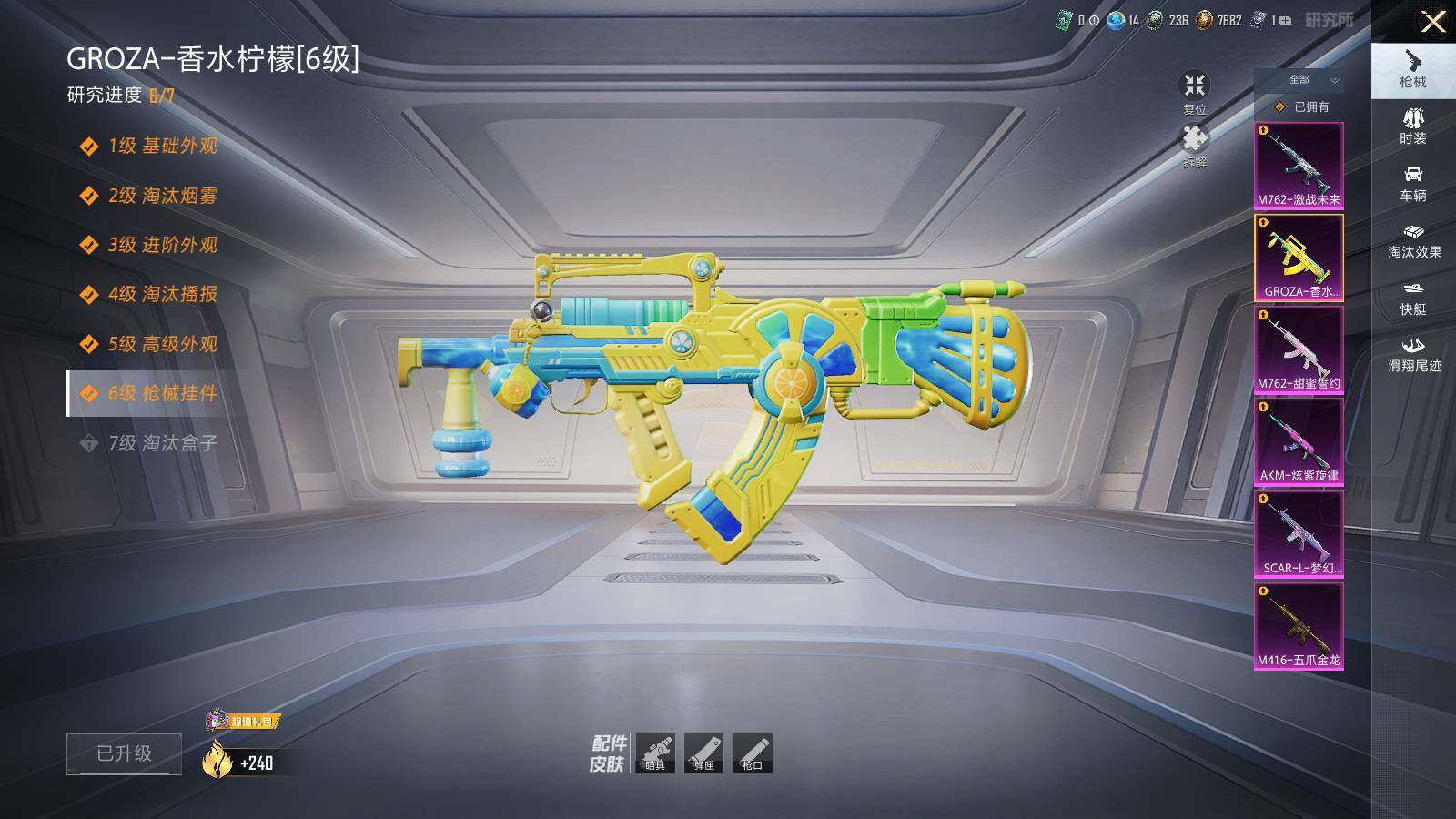 AKM-炫紫旋律,SCAR-L-梦幻火箭,M416-五爪金龙,GROZA-香水柠檬,M762-甜蜜誓约,M762-激战未来