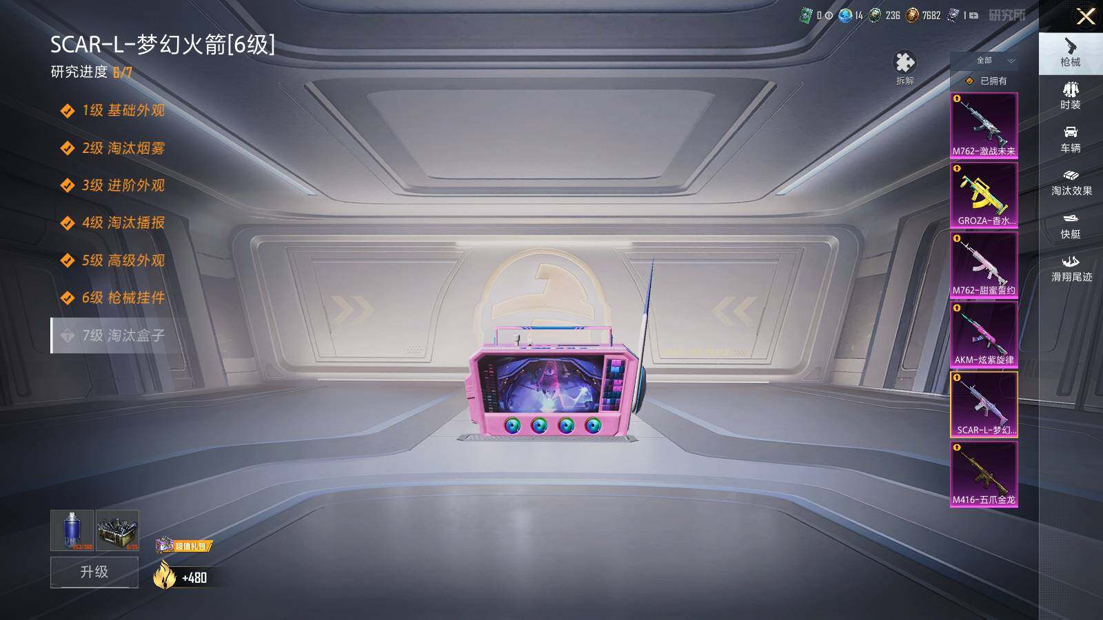 【粉色枪皮等级】:AKM-炫紫旋律(七级),SCAR-L-梦幻火箭(六级),M416-五爪金龙(七级),GROZA-香水柠檬(六级),M762-甜蜜誓约(七级),M762-激战未来(五级)