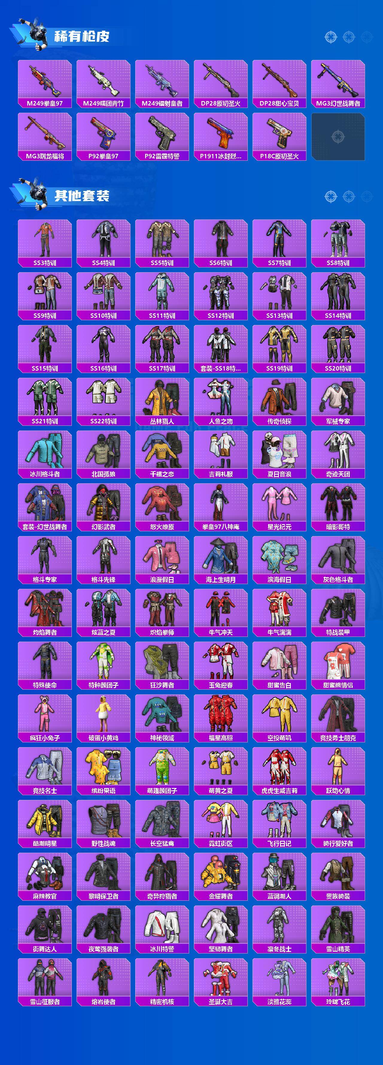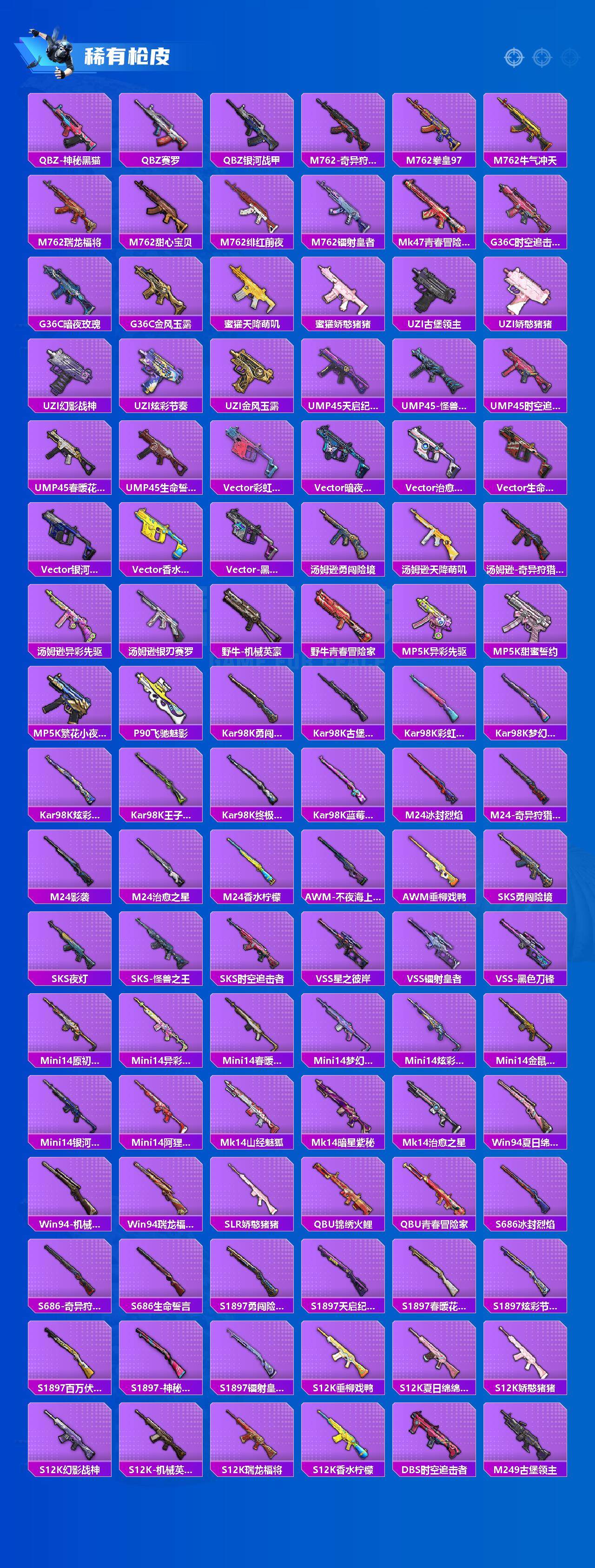 【稀有枪皮】:AKM-PEL轰鸣竞梦者,AKM-夜灯,AKM-天启纪元,AKM-奇异狩猎者,AKM-彩虹符号,AKM-春暖花开,AKM-灼热熔岩,AKM-萌趣颜团子,AKM-虎虎生威,AKM-阿狸红,AKM-霓虹街区,M16A4-幻世战舞者,M16A4-机械英豪,M16A4-红色方程式,M16A4-魔法学院,SCAR-L-怪兽之王,SCAR-L-炫彩节奏,SCAR-L-玉兔迎春,SCAR-L-王牌四分卫,SCAR-L-金风玉露,SCAR-L-黄金龙骨,M416-仓鼠灰灰,M416-蓝色火焰,GROZA-异彩先驱,GROZA-彩虹符号,GROZA-春暖花开,GROZA-治愈之星,GROZA-生命誓言,GROZA-银河战甲,GROZA