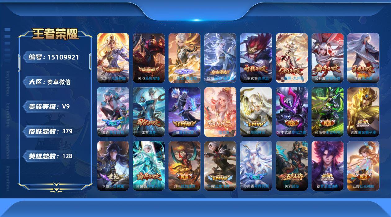 [15109921]社交限制-介意勿拍-安卓WX-V9-最强王者段位-128英雄-379皮肤-2典藏皮肤-1典藏英雄-1无双-1珍品传说-35传说-113史诗 【英雄全皮】:孙权全皮,鬼谷子全皮 【荣耀典藏】:武则天英雄,花木兰九霄神辉,关羽赤影疾锋 【无双皮肤】:曜器灵螭龙剑 【珍品传说】:嫦娥器灵落星盏 【传说皮肤】:后羿神树通天,西施续相思,澜愿照九州拓,云缨幻光神枪,桑启鸣野蒿,铠冥王哈迪斯,亚连落雪白狼,典韦战鼓燎原,澜逐花归海,张飞百相守梦,孙尚香异界灵契,赵云淬星耀世,周瑜音你心动,李元芳飞鸢探春,公孙离祈雪灵祝,诸葛亮时雨天司,铠绛天战甲,镜炽阳神光,虞姬启明星使,关羽武圣,曜云鹰飞将,李信一念神魔,伽罗太华,干将莫邪久胜战神,虞姬云霓雀翎,达摩黄金狮子座,百里玄策白虎志,花木兰冠军飞将,后羿黄金射手座,貂蝉仲夏夜之梦,李白凤求凰,孙尚香末日机甲,宫本武藏地狱之眼,孙悟空地狱火,武则天海洋之心 【限定皮肤】:白起狰,铠冥王哈迪斯,暃埋骨钱,蒙犽顽岩魄,大乔绒语心约,姜子牙天穹之誓,狄仁杰阴阳师,虞姬凯尔特女王,赵云皇家上将,墨子神迹守卫,妲己热情桑巴,嬴政优雅恋人,孙尚香异界灵契,庄周蜃楼王,庄周高山流水,高渐离死亡摇滚,高渐离玩趣恶龙,孙膑妖精王,扁鹊炼金王,扁鹊奇幻香踪,芈月重明,芈月幻夜卜梦,吕布猎兽之王,吕布御风骁将,元歌云间偶戏,元歌无心,夏侯惇朔风刀,甄姬落雪兰心,曹操烛龙,典韦穷奇,典韦蓝屏警告,马可波罗暗影游猎,狄仁杰魔术师,狄仁杰万华元夜,达摩星际陆战队,达摩沙漠行僧,项羽海滩派对,老夫子醍醐杖,老夫子航海奇遇记,关羽冰锋战神,关羽武圣,程咬金演武夺筹,露娜一生所爱,韩信逐梦之影,王昭君凤凰于飞,兰陵王金庭之子,花木兰青春决赛季,花木兰瑞麟志,花木兰默契交锋,亚瑟潮玩骑士王,孙悟空至尊宝,孙悟空大圣娶亲,孙悟空孙行者,牛魔御旌,后羿如梦令,后羿圣弓游侠,张飞百相守梦,李元芳云中旅人,虞姬霸王别姬,虞姬启明星使,钟馗驱傩正仪,杨戬潮玩骑兵,女娲朔望之晖,干将莫邪胡桃夹子,干将莫邪真爱魔法,雅典娜单词大作战,雅典娜黎明之约,蔡文姬繁星吟游,太乙真人饕餮,鬼谷子原初探秘者,鬼谷子五谷丰年,诸葛亮时雨天司,大乔白鹤梁神女,黄忠火炮绅士,铠青龙志,苏烈千军破阵,百里玄策白虎志,百里玄策原初追逐者,弈星混沌棋,梦奇顽趣,公孙离蜜橘之夏,公孙离祈雪灵祝,沈梦溪大漠