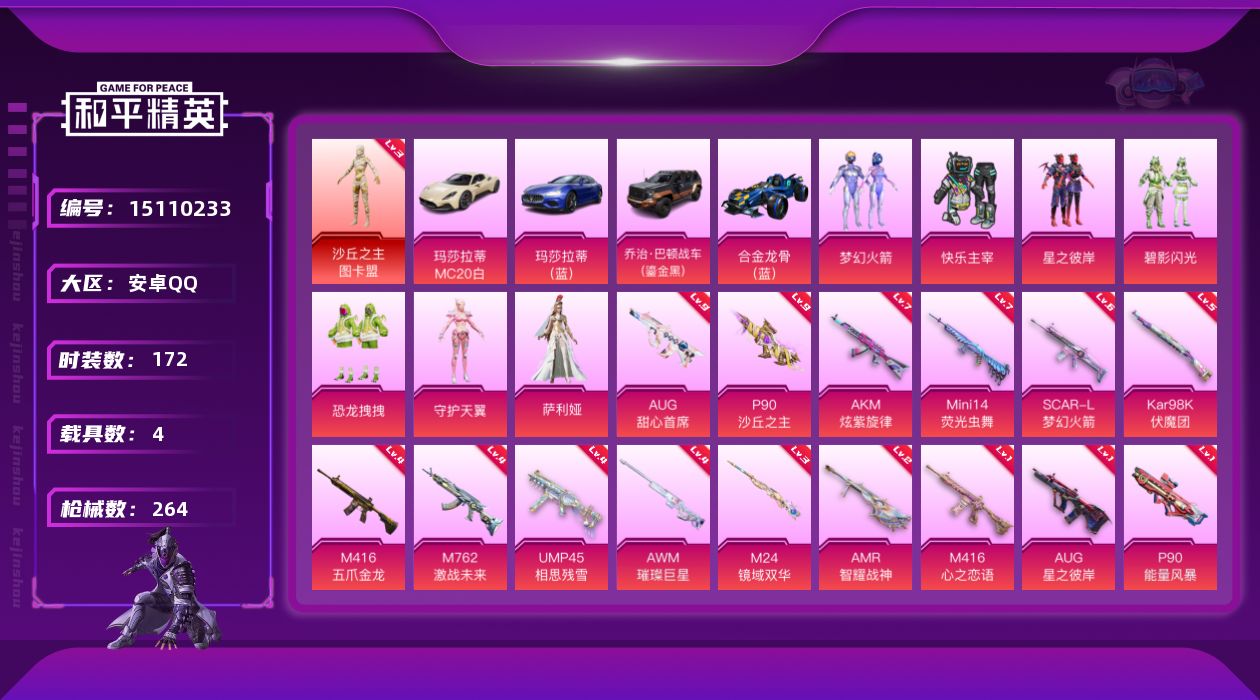 - PX_2079701- 安卓手Q-10王牌印记-17粉装-10特效枪-3载具-69248热力值-165套装-191枪皮-4卓越印记-2传奇印记 【17粉装】,雪国幻梦,梦幻火箭,放客神游,新星烈龙,怪诞乔克,凤凰座 一辉,花间之火,闲梦青缨,星之信仰,冰炎战车,紫钛骑兵,白兰星,小可学妹,智能音符,荒野猎神,萨利娅,旋转彩虹 【10特效枪】AKM-绿萝繁花-5级 AKM-星际浪客-1级 SCAR-