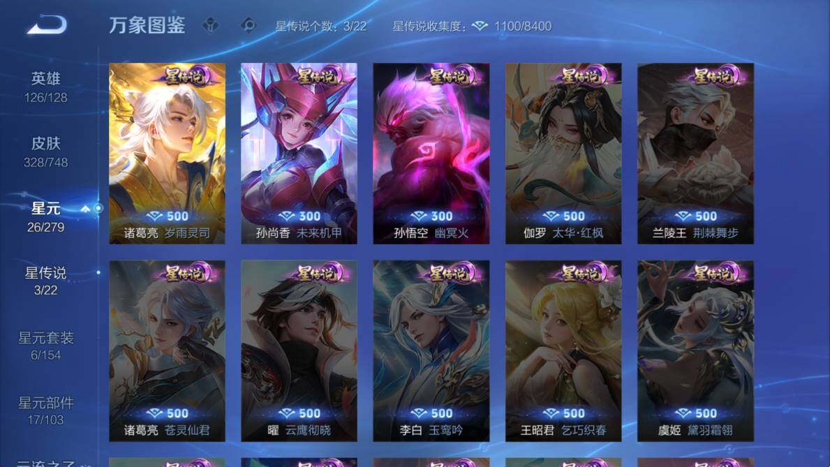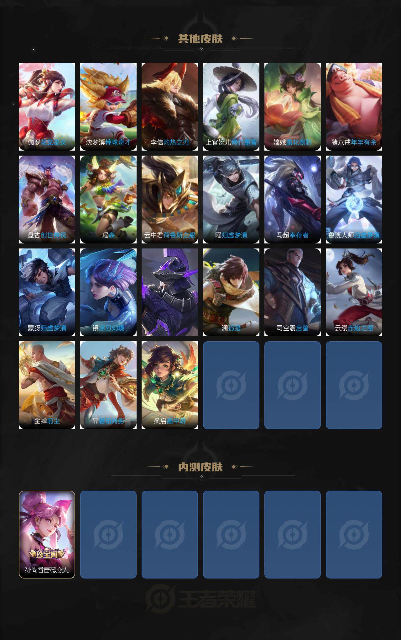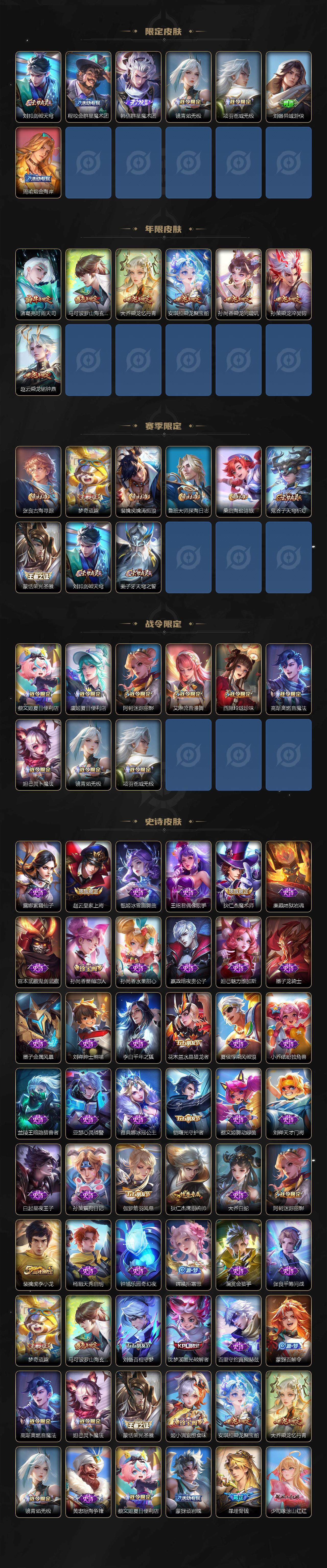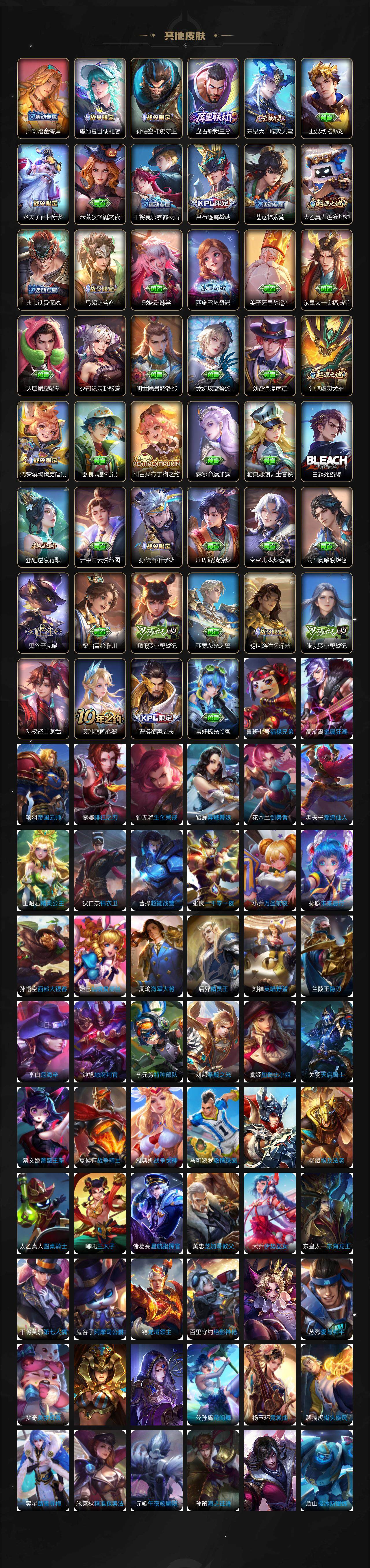 【限定皮肤】:公孙离离恨烟,暃埋骨钱,蒙犽顽岩魄,蔡文姬夏日便利店,虞姬夏日便利店,姜子牙天穹之誓,李白谪仙醉月,狄仁杰阴阳师,赵云皇家上将,孙尚香蔷薇恋人,阿轲迷踪丽影,马可波罗山海玄木吟,狄仁杰魔术师,项羽海滩派对,刘备百相守梦,虞姬启明星使,诸葛亮时雨天司,梦奇顽趣,沈梦溪匿光破解者,裴擒虎李小龙,裴擒虎擒涛扼浪,嫦娥拒霜思,西施玲珑珍味,鲁班大师探海日志,桑启海盐诗旅,艾琳流音漫舞,张良古海寻踪,蒙犽百解令,蒙恬荣光圣徽,高渐离燃音魔法,妲己灵卜魔法,鬼谷子天穹祈灯,马超琥珀纪元,姬小满妄想食味,大乔乘龙忆丹青,安琪拉乘龙聚宝船,孙尚香乘龙问璇玑,孙策乘龙淬吴钩,赵云乘龙铭钟鼎,吕布曦玄引,貂蝉曦玄引,沈梦溪龙舞盛年,刘邦剑破天穹,程咬金群星魔术团,韩信群星魔术团,镜青焰无极,项羽苍威无极,刘备异域游侠,周瑜熔金海岸