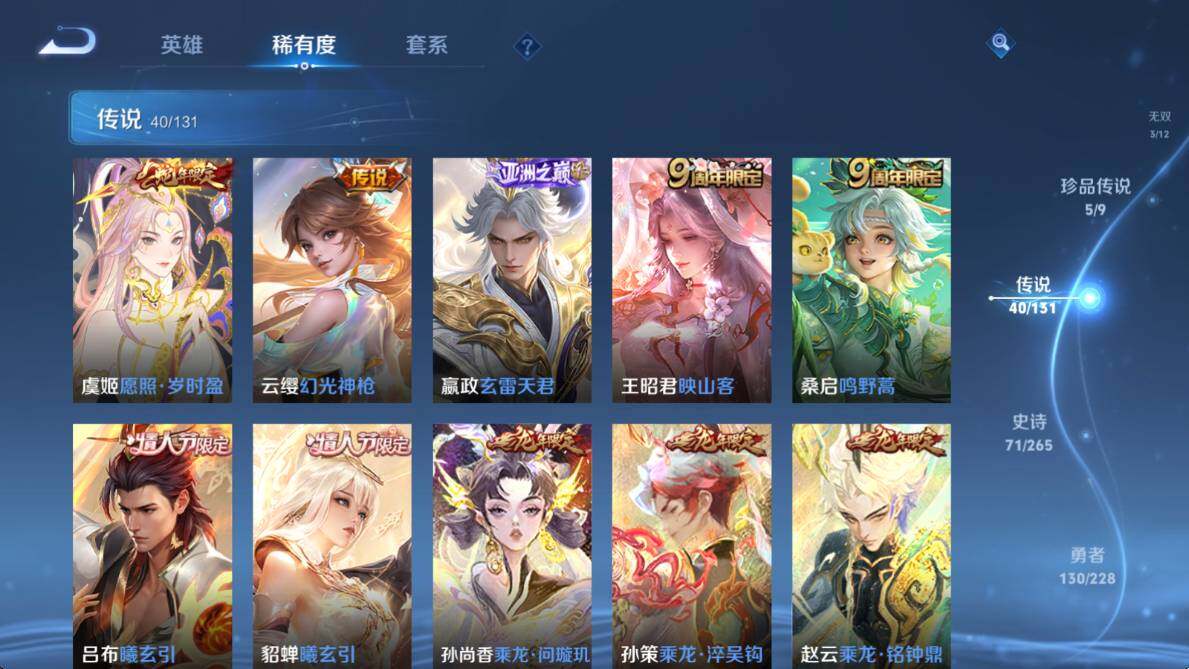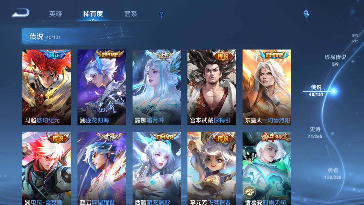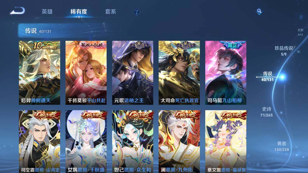 【传说皮肤】:后羿神树通天,干将莫邪千山共赴,元歌诡秘之主,大司命死亡执政官,司马懿九山相柳,司空震愿照山河定,女娲愿照千秋盛,妲己愿照众生和,澜愿照九州拓,蔡文姬愿照福禄聚,虞姬愿照岁时盈,云缨幻光神枪,嬴政玄雷天君,王昭君映山客,桑启鸣野蒿,吕布曦玄引,貂蝉曦玄引,孙尚香乘龙问璇玑,孙策乘龙淬吴钩,赵云乘龙铭钟鼎,马超琥珀纪元,澜逐花归海,露娜霜月吟,宫本武藏惊梅引,东皇太一灼幽烈阳,澜电玩雷克斯,赵云淬星耀世,西施游龙清影,李元芳飞鸢探春,诸葛亮时雨天司,铠绛天战甲,镜炽阳神光,虞姬启明星使,曜云鹰飞将,李信一念神魔,貂蝉猫影幻舞,达摩黄金狮子座,孙尚香末日机甲,孙悟空地狱火,狄仁杰超时空战士