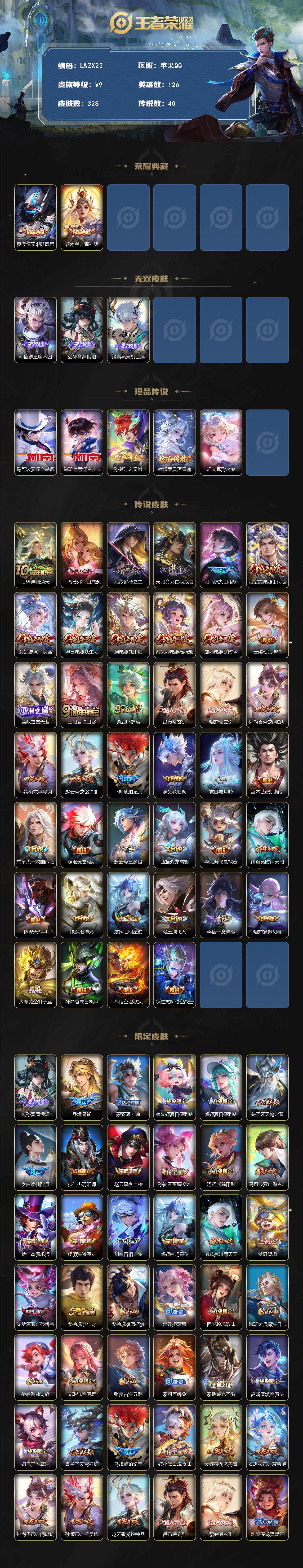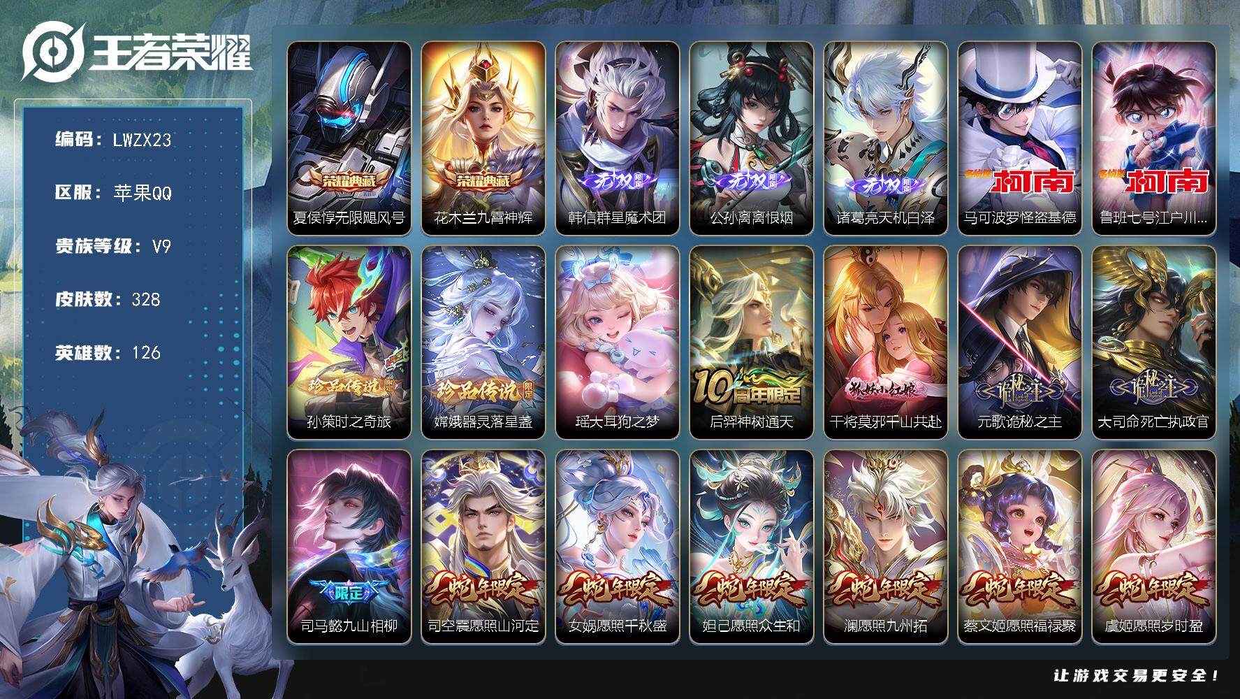 [15111007]满蛇年限定【特价出售/店主推荐】苹果Q-V9-最强王者段位-126英雄-328皮肤-2典藏皮肤-3无双-5珍品传说-40传说-71史诗