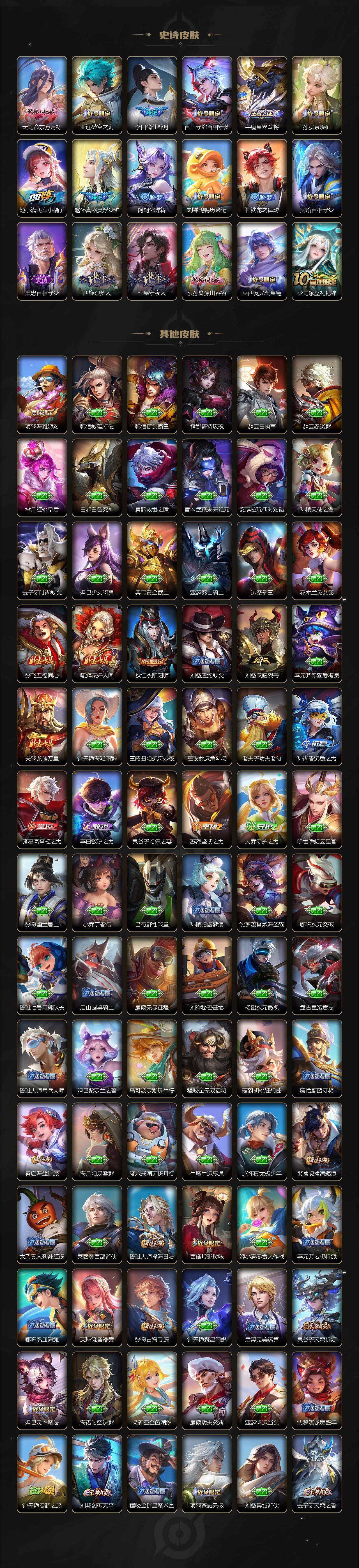 大乔白蛇,伽罗箭羽风息,孙策猫狗日记,露娜紫霞仙子,王昭君偶像歌手,雅典娜冰冠公主,墨子龙骑士,刘禅绅士熊喵,刘禅天才门将,白起星夜王子,兰陵王暗隐猎兽者,宫本武藏鬼剑武藏,亚瑟心灵战警,钟馗乐园奇幻夜,杨戬天秀·启明,蔡文姬舞动绿茵,廉颇地狱岩魂,小乔缤纷独角兽,夏侯惇乘风破浪,花木兰水晶猎龙者,铠曙光守护者,墨子金属风暴,嬴政暗夜贵公子,嫦娥拒霜思,李白千年之狐,澜赏金猎手,张良千筹问战,刘备百相守梦,沈梦溪匿光破解者,百里守约真我赫兹,蒙犽百解令,高渐离燃音魔法,大乔乘龙·忆丹青,安琪拉乘龙·聚宝船,李白谪仙醉月,姬小满飞车小橘子,赵怀真器灵·浮梦炉