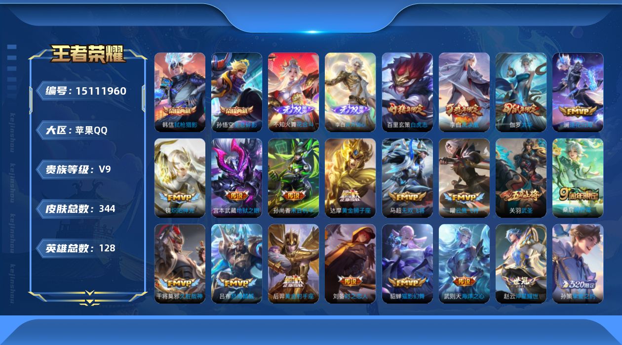 [15111960]【特价出售/店主推荐】苹果Q-V9-最强王者段位-128英雄-344皮肤-2典藏皮肤-1典藏英雄-2无双-23传说-98史诗