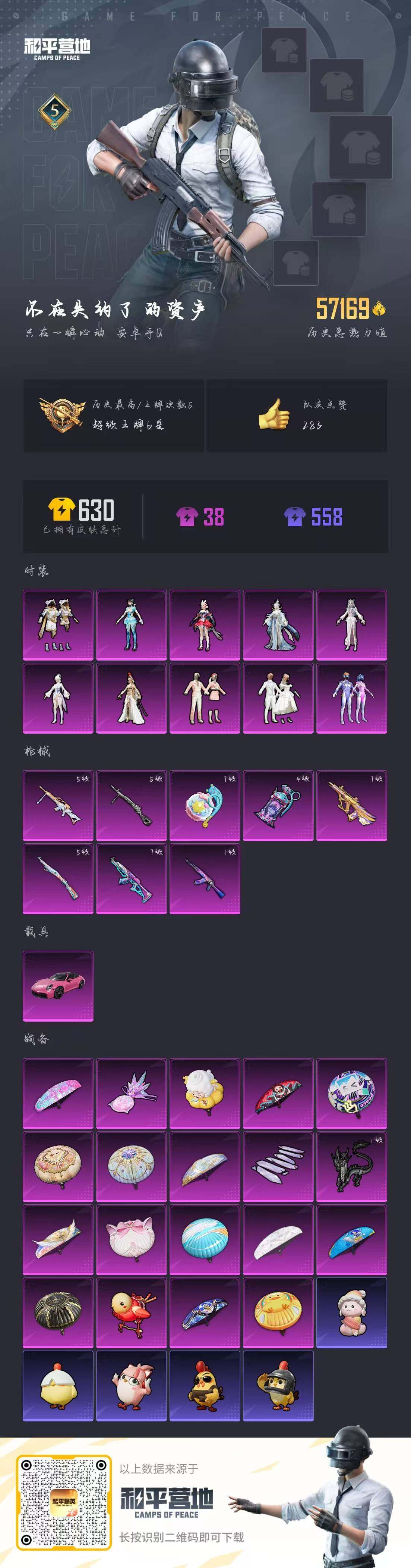 - [12230298]总资产:209M 1干员外观 1近战传说 17传说枪械 哈夫币:37.778K 可二次 可修改实名 优质装备:近战-影锋 烽火地带段位:铂金 全面战场段位:上等兵 传说武器皮肤:AS Val突击步枪-蛇年祥瑞,SCAR-H战斗步枪-水墨云图,SR-25射手步枪-水墨云图,SCAR-H战斗步枪-铁艺苍穹,AK-12突击步枪-特斯拉线圈,SR-3M紧凑突击步枪-特斯拉线圈,UZI冲锋枪-特斯拉线圈,勇士冲锋枪-能天使-午夜邮差,93R-捞点薯条,AWM狙击步枪-捞点薯条,725双管霰弹枪-送葬人-无题密令,M4A1突击步枪-阿米娅,CAR-15突击步枪-阿米娅,复合弓-黑-天际线,M7战斗步枪-维京,M4A1突击步枪-蚀金玫瑰 史诗武器皮肤:SR-3M紧凑突击步枪-英雄,QBZ95-1突击步枪-ACE,AUG突击步枪-特勤执行,M4A1突击步枪-特勤执行,Vector冲锋枪-红色彗星,PTR-32战斗步枪-ACE,SKS射手步枪-ACE,PKM通用机枪-蝮蛇,M700狙击步枪-蝮蛇,AUG突击步枪-蝮蛇,G3战斗步枪-战场英杰,SR-3M紧凑突击步枪-荒野求生,PKM通用机枪-荒野求生,M1014霰弹枪-林中猎手,SVD狙击步枪-荒野求生,MP7冲锋枪-无垢,腾龙突击步枪-无垢,SCAR-H战斗步枪-囚徒,SV-98狙击步枪-林中猎手,M250通用机枪-囚徒,SV-98狙击步枪-囚徒,P90冲锋枪-紧急戒备,PTR-32突击步枪-Old Habits,QJB201轻机枪-Old Habits,M16A4突击步枪-竞赛选手,SVD狙击步枪-暗夜猎手,沙漠之鹰-曙光,S12K霰弹枪-曙光,QBZ95-1突击步枪-曙光,UZI冲锋枪-危险实验,M249轻机枪-维京,SCAR-H战斗步枪-危险实验,Vector冲锋枪-阿萨拉文明,93R-博士,MP5冲锋枪-深海恐惧,勇士冲锋枪-深海恐惧,SG552突击步枪-深海恐惧,AKM突击步枪-林中猎手,M700狙击步枪-竞技风,QSZ92G-风林火山,PKM通用机枪-英雄,M4A1突击步枪-趣味贴纸,MP5冲锋枪-趣味贴纸,SCAR-H战斗步枪-趣味贴纸,AUG突击步枪-战术迷彩 干员外观:红狼-蚀金玫瑰