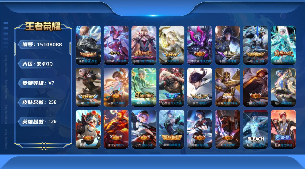 - [11497617]V7 1典藏 1传说 123英雄 312皮肤 可修改实名 荣耀水晶:全息碎影(猴子典藏) 珍宝阁皮:妄想食味,优雅恋人,蔷薇恋人 限定皮:逐霄战戟,鸣野蒿,傲雪梅枪,遇见飞天,五谷丰年,游园惊梦,梁祝,天狼溯光者,天狼绘梦者,李小龙,孙行者,山海·玄木吟(马可年限) 史诗皮:龙之律动,紫霞仙子,白龙吟,黄金分割率,特工魅影,千年之狐,江河有灵,百解令(蒙犽),冰冠公主,偶像歌手,无限星赏官,电玩·爆裂旋风,末日机甲-吕布,猫狗日记-孙策,时之恋人-孙尚香,乱世虎臣,节奏热浪,女仆咖啡,摇滚巨星,水果甜心,绅士熊喵,天才门将,星夜王子,心灵骇客,功夫厨神,德古拉伯爵,暗隐猎兽者,幽灵船长,鬼剑武藏,心灵战警,天秀·启明,舞动绿茵,纤云弄巧,繁星吟游(呼啦呼啦),拒霜思,缤纷独角兽,乘风破浪,逐浪之夏,水晶猎龙者,曙光守护者,箭羽风息,唤灵魅影,金属风暴,圣诞狂欢,圣诞恋歌,鹰眼统帅,暗夜贵公子,魅力维加斯,千筹问战,无心,未来纪元-赵云