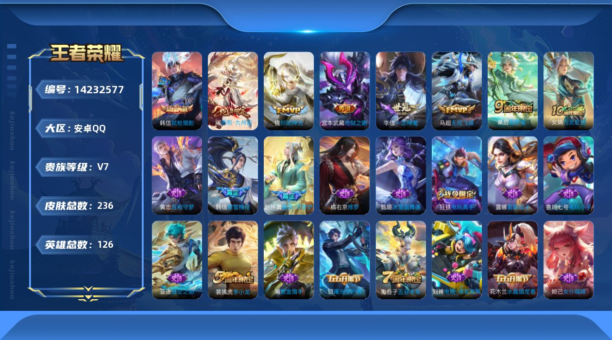 - [12946312]安卓Q-V7-至尊星耀I段位-125英雄-168皮肤-1典藏-1传说-44史诗 【荣耀典藏】:韩信弑枪猎影 【传说皮肤】:赵云淬星耀世 【限定皮肤】:白起狰,狄仁杰阴阳师,虞姬凯尔特女王,赵云皇家上将,墨子神迹守卫,嬴政白昼王子,孙尚香蔷薇恋人,庄周高山流水,孙膑妖精王,扁鹊炼金王,芈月重明,吕布猎兽之王,元歌云间偶戏,夏侯惇朔风刀,甄姬游园惊梦,曹操烛龙,典韦穷奇,狄仁杰魔术师,狄仁杰万华元夜,达摩星际陆战队,达摩沙漠行僧,项羽海滩派对,老夫子醍醐杖,老夫子航海奇遇记,程咬金演武夺筹,兰陵王金庭之子,亚瑟潮玩骑士王,牛魔御旌,李元芳云中旅人,钟馗驱傩正仪,杨玉环遇见飞天,雅典娜黎明之约,太乙真人饕餮,鬼谷子原初探秘者,鬼谷子五谷丰年,苏烈千军破阵,百里玄策原初追逐者,弈星混沌棋,梦奇顽趣,沈梦溪大漠名商,明世隐疑决卦,裴擒虎擒涛扼浪,狂铁御狮,米莱狄御霄,米莱狄胡桃异想国,盾山御銮,上官婉儿梁祝,鲁班大师探海日志,桑启海盐诗旅,张良古海寻踪,蒙恬荣光圣徽,鬼谷子天穹祈灯 【赛季限定】:孙膑妖精王,扁鹊炼金王,白起狰,芈月重明,夏侯惇朔风刀,曹操烛龙,典韦穷奇,狄仁杰万华元夜,达摩沙漠行僧,老夫子醍醐杖,程咬金演武夺筹,兰陵王金庭之子,张良古海寻踪,牛魔御旌,李元芳云中旅人,虞姬凯尔特女王,钟馗驱傩正仪,雅典娜黎明之约,太乙真人饕餮,鬼谷子原初探秘者,苏烈千军破阵,百里玄策原初追逐者,弈星混沌棋,梦奇顽趣,沈梦溪大漠名商,明世隐疑决卦,裴擒虎擒涛扼浪,狂铁御狮,米莱狄御霄,盾山御銮,鲁班大师探海日志,桑启海盐诗旅,鬼谷子天穹祈灯,蒙恬荣光圣徽 【战令限定】:墨子神迹守卫,嬴政白昼王子,吕布猎兽之王,元歌云间偶戏,达摩星际陆战队,老夫子航海奇遇记,亚瑟潮玩骑士王,米莱狄胡桃异想国 【史诗皮肤】:赵云皇家上将,赵云未来纪元,貂蝉圣诞恋歌,甄姬冰雪圆舞曲,王昭君偶像歌手,狄仁杰魔术师,廉颇地狱岩魂,宫本武藏鬼剑武藏,孙尚香蔷薇恋人,孙尚香水果甜心,嬴政摇滚巨星,妲己魅力维加斯,墨子金属风暴,吕布圣诞狂欢,刘禅绅士熊喵,曹操幽灵船长,吕布末日机甲,张飞乱世虎臣,兰陵王暗隐猎兽者,诸葛亮黄金分割率,甄姬游园惊梦,雅典娜冰冠公主,安琪拉心灵骇客,百里守约特工魅影,李元芳逐浪之夏,程咬金功夫厨神,白起星夜王子,杨玉环遇见飞天,嬴政白昼王子,孙策猫狗日记,狄仁杰鹰眼统帅,上官婉儿