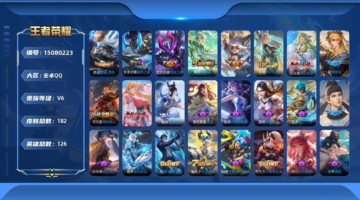 [15080223]【店主推荐捡漏号!可直接换绑】安卓Q-V6-最强王者段位-126英雄-182皮肤-1典藏皮肤-4传说-63史诗-1星元 【荣耀典藏】:李白鸣剑曳影 【传说皮肤】:后羿神树通天,桑启鸣野蒿,李元芳飞鸢探春,宫本武藏地狱之眼 【限定皮肤】:暃埋骨钱,蒙犽顽岩魄,蔡文姬夏日便利店,大乔绒语心约,虞姬夏日便利店,姜子牙天穹之誓,杨戬破阵退雄兵,李白谪仙醉月,狄仁杰阴阳师,赵云皇家上将,孙尚香蔷薇恋人,孙膑寅虎展翼,扁鹊奇幻香踪,狄仁杰魔术师,项羽海滩派对,杨戬潮玩骑兵,鬼谷子五谷丰年,百里玄策原初追逐者,裴擒虎擒涛扼浪,云中君纤云弄巧,嫦娥如梦令,嫦娥拒霜思,西施玲珑珍味,鲁班大师探海日志,桑启海盐诗旅,戈娅驭风魔法,艾琳流音漫舞,司空震地狱燃心,阿古朵江河有灵,张良古海寻踪,蒙犽百解令,蒙恬荣光圣徽,高渐离燃音魔法,妲己灵卜魔法,鬼谷子天穹祈灯,伽罗琥珀纪元,沈梦溪龙舞盛年,鲁班七号蔬乡物语,李元芳蔬乡物语,刘邦剑破天穹,程咬金群星魔术团,镜青焰无极,项羽苍威无极,刘备异域游侠,周瑜熔金海岸 【年限皮肤】:孙膑寅虎展翼 【赛季限定】:张良古海寻踪,百里玄策原初追逐者,裴擒虎擒涛扼浪,鲁班大师探海日志,桑启海盐诗旅,鬼谷子天穹祈灯,蒙恬荣光圣徽,刘邦剑破天穹,姜子牙天穹之誓 【战令限定】:蔡文姬夏日便利店,虞姬夏日便利店,扁鹊奇幻香踪,艾琳流音漫舞,杨戬潮玩骑兵,西施玲珑珍味,司空震地狱燃心,戈娅驭风魔法,高渐离燃音魔法,妲己灵卜魔法,鲁班七号蔬乡物语,李元芳蔬乡物语,镜青焰无极,项羽苍威无极 【史诗皮肤】:露娜紫霞仙子,赵云皇家上将,赵云未来纪元,甄姬冰雪圆舞曲,王昭君偶像歌手,狄仁杰魔术师,宫本武藏鬼剑武藏,孙尚香蔷薇恋人,孙尚香水果甜心,妲己魅力维加斯,妲己女仆咖啡,墨子金属风暴,曹操幽灵船长,李白千年之狐,吕布末日机甲,张飞乱世虎臣,花木兰水晶猎龙者,刘邦德古拉伯爵,夏侯惇乘风破浪,小乔缤纷独角兽,兰陵王暗隐猎兽者,雅典娜冰冠公主,安琪拉心灵骇客,百里守约特工魅影,铠曙光守护者,刘禅天才门将,李元芳逐浪之夏,阿轲节奏热浪,大乔猫狗日记,狄仁杰鹰眼统帅,娜可露露晚萤,嫦娥如梦令,小乔青蛇,孙尚香时之恋人,百里玄策原初追逐者,云中君纤云弄巧,嫦娥拒霜思,孙膑寅虎展翼,鬼谷子五谷丰年,扁鹊奇幻香踪,刘禅电玩爆裂旋风,戈娅驭风魔法,司空震地狱燃心,阿古朵江河有灵,蒙犽百解