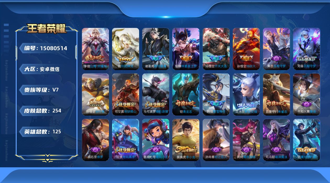 [15080514]AK463:安卓WX-V7-至尊星耀II段位-123英雄-245皮肤-0典藏-0珍品无双-0无双-0珍品传说-6传说-64史诗