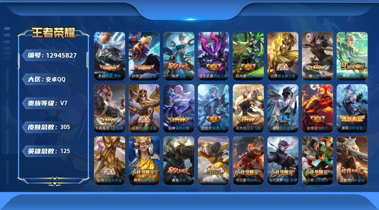 [12945827]中路34段【特价急出/详情看图】:安卓Q-V7-最强王者段位-125英雄-305皮肤-3典藏-15传说-77史诗