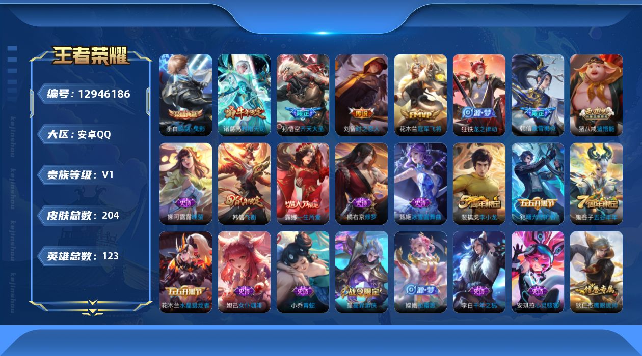 [12946186]【特价急出/详情看图】:安卓Q-V1-最强王者段位-123英雄-204皮肤-1典藏-4传说-56史诗