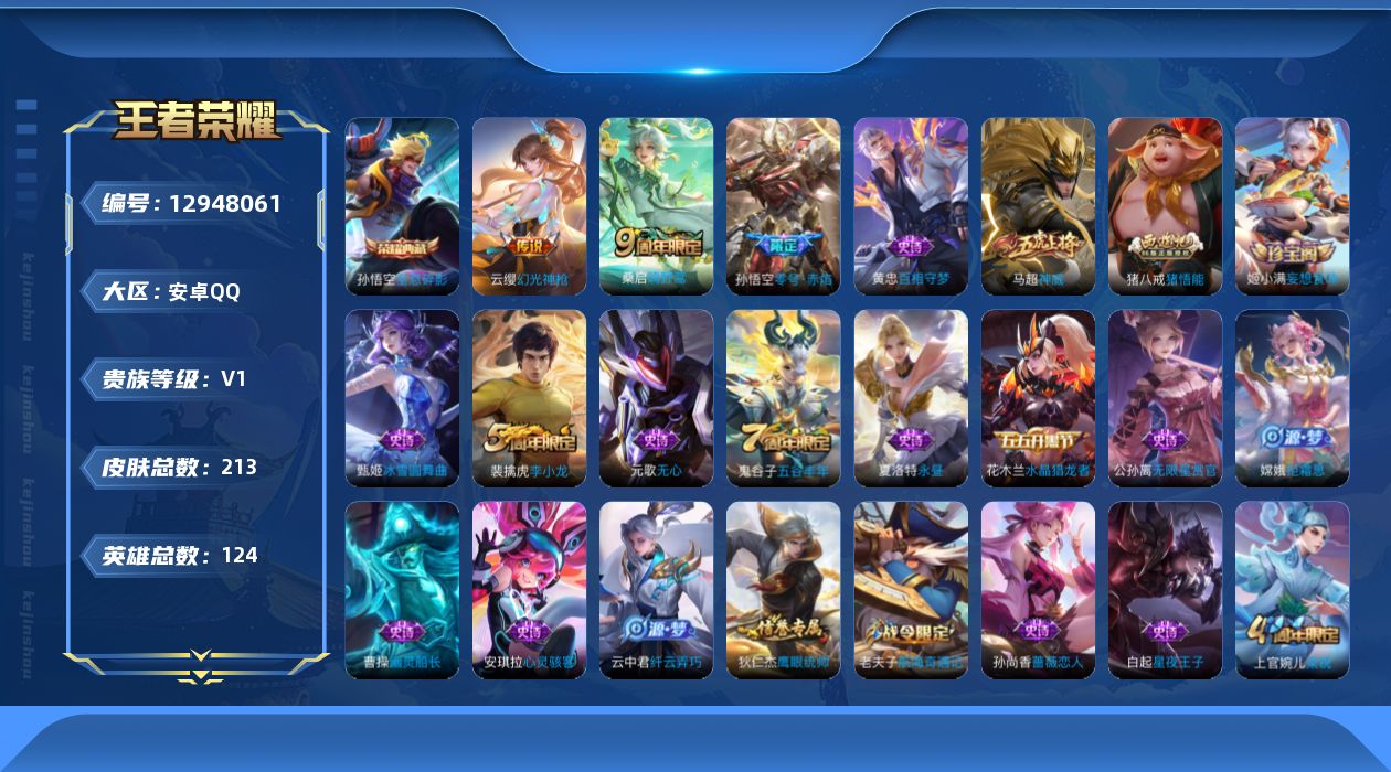 [12948061]【特价急出/详情看图】:安卓Q-V0-永恒钻石IV段位-123英雄-213皮肤-1典藏-3传说-47史诗 【荣耀典藏】:孙悟空全息碎影 【传说皮肤】:云缨幻光神枪,桑启鸣野蒿,孙悟空零号赤焰 【限定皮肤】:姜子牙天穹之誓,狄仁杰阴阳师,赵云皇家上将,墨子神迹守卫,孙尚香蔷薇恋人,庄周高山流水,高渐离死亡摇滚,钟无艳超时空战士,元歌无心,甄姬落雪兰心,狄仁杰万华元夜,达摩沙漠行僧,项羽海滩派对,老夫子航海奇遇记,程咬金演武夺筹,兰陵王金庭之子,孙悟空零号赤焰,后羿圣弓游侠,李元芳云中旅人,钟馗驱傩正仪,干将莫邪胡桃夹子,干将莫邪真爱魔法,雅典娜单词大作战,太乙真人华丽摇滚,鬼谷子原初探秘者,鬼谷子五谷丰年,苏烈千军破阵,百里玄策原初追逐者,梦奇顽趣,沈梦溪大漠名商,裴擒虎李小龙,裴擒虎擒涛扼浪,云中君纤云弄巧,猪八戒猪悟能,上官婉儿梁祝,嫦娥拒霜思,蒙犽狂想玩偶喵,鲁班大师探海日志,桑启海盐诗旅,阿古朵江河有灵,张良古海寻踪,鬼谷子天穹祈灯,姬小满妄想食味,沈梦溪龙舞盛年,刘邦剑破天穹,程咬金群星魔术团,镜青焰无极,项羽苍威无极,周瑜熔金海岸 【年限皮肤】:马超神威 【赛季限定】:狄仁杰万华元夜,达摩沙漠行僧,程咬金演武夺筹,兰陵王金庭之子,张良古海寻踪,李元芳云中旅人,钟馗驱傩正仪,鬼谷子原初探秘者,苏烈千军破阵,百里玄策原初追逐者,梦奇顽趣,沈梦溪大漠名商,裴擒虎擒涛扼浪,鲁班大师探海日志,桑启海盐诗旅,鬼谷子天穹祈灯,刘邦剑破天穹,姜子牙天穹之誓 【战令限定】:墨子神迹守卫,钟无艳超时空战士,甄姬落雪兰心,老夫子航海奇遇记,后羿圣弓游侠,干将莫邪真爱魔法,雅典娜单词大作战,蒙犽狂想玩偶喵,镜青焰无极,项羽苍威无极 【史诗皮肤】:赵云皇家上将,赵云未来纪元,貂蝉圣诞恋歌,甄姬冰雪圆舞曲,廉颇地狱岩魂,宫本武藏鬼剑武藏,孙尚香蔷薇恋人,孙尚香水果甜心,嬴政摇滚巨星,妲己魅力维加斯,墨子龙骑士,墨子金属风暴,曹操幽灵船长,韩信白龙吟,花木兰水晶猎龙者,刘邦德古拉伯爵,兰陵王暗隐猎兽者,雅典娜冰冠公主,安琪拉心灵骇客,刘禅天才门将,白起星夜王子,阿轲节奏热浪,孙策猫狗日记,狄仁杰鹰眼统帅,公孙离无限星赏官,上官婉儿梁祝,马超神威,蒙犽狂想玩偶喵,百里玄策原初追逐者,裴擒虎李小龙,云中君纤云弄巧,老夫子航海奇遇记,杨戬天秀启明,干将莫邪真爱魔法,猪八戒猪悟能,庄周高山流