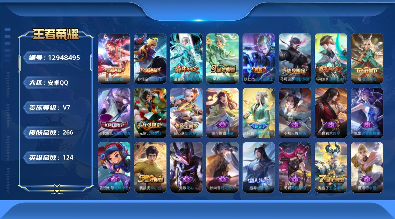 [12948495]【特价急出/详情看图】安卓Q-V7-至尊星耀V段位-123英雄-266皮肤-2典藏-3传说-74史诗