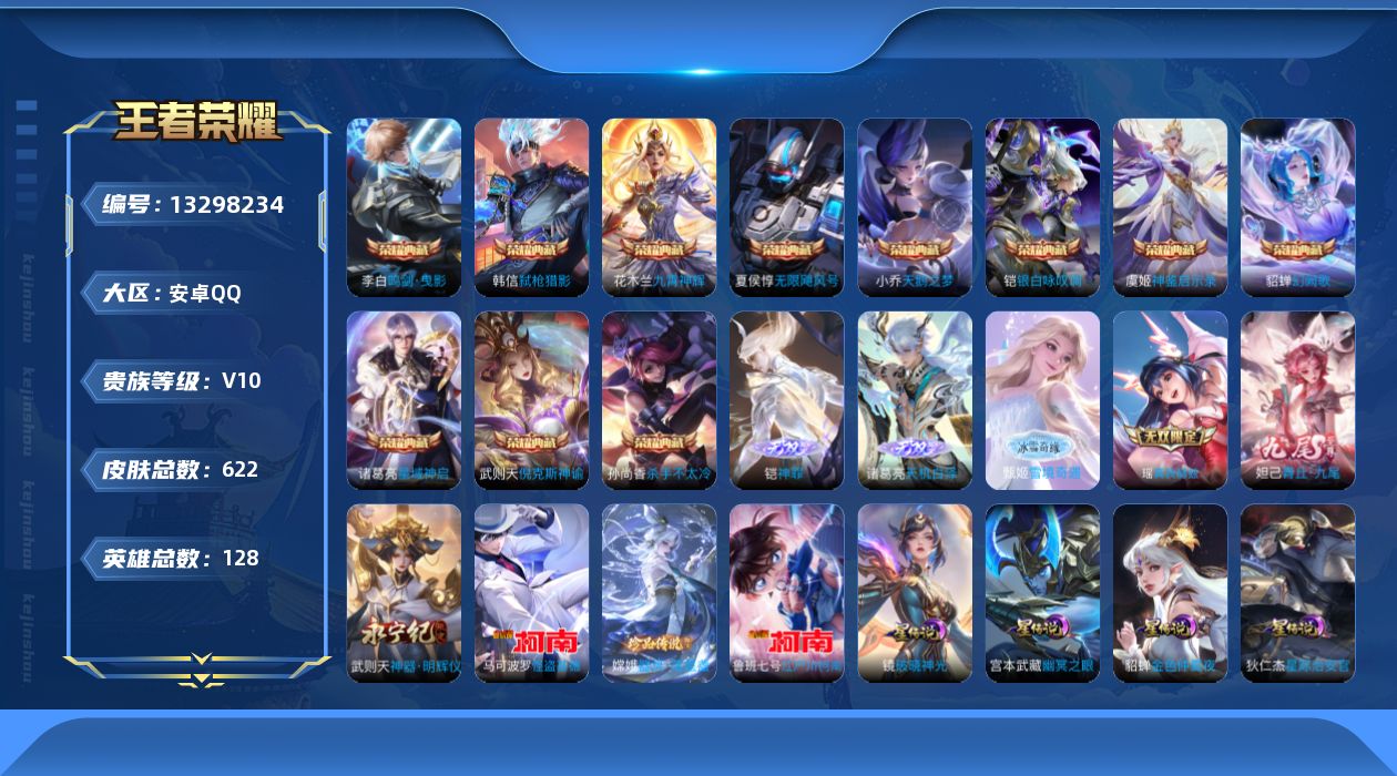 - [12089794]V8 1典藏 15传说 122英雄 219皮肤 可修改实名 优质装备:全息碎影(猴子典藏),黄金狮子座,黄金射手座,冠军飞将,绛天战甲(鸡嘴战神),久胜战神,云霓雀翎,末日机甲-孙尚香(绿蚂蚱),地狱火,零号·赤焰,地狱之眼 传说皮:典韦战鼓燎原 珍宝阁皮:优雅恋人 限定皮:逐霄战戟,凤求凰(白切鸡),时雨天司(水龙头),瑞麟志(木兰年限),遇见飞天,五谷丰年,青龙志(铠年限),冰锋战神,天狼运算者,游园惊梦,梁祝,御风骁将(吕布年限),逐梦之星,天狼征服者,奔雷神使(牛魔年限),祈雪灵祝(雪兔子),李小龙,玄武志(苏烈年限),朱雀志(守约年限),霸王别姬-虞姬,猪悟能,大圣娶亲,引擎之心,冰霜恋舞曲 史诗皮:星界特工,电玩小子(小书包),白龙吟,黄金分割率,特工魅影,千年之狐,永昼,魅语,百解令(蒙犽),无限星赏官,冰冠公主,偶像歌手,末日机甲-吕布,时之恋人-孙尚香,乱世虎臣,节奏热浪,女仆咖啡,摇滚巨星,星夜王子,心灵骇客,德古拉伯爵,暗隐猎兽者,鬼剑武藏,舞动绿茵,地狱岩魂,纤云弄巧,拒霜思,缤纷独角兽,乘风破浪,逐浪之夏,水晶猎龙者,唤灵魅影,金属风暴,原初追逐者,圣诞狂欢,圣诞恋歌,鹰眼统帅,魅力维加斯,赏金猎手,天秀·音浪,无心,未来纪元-赵云