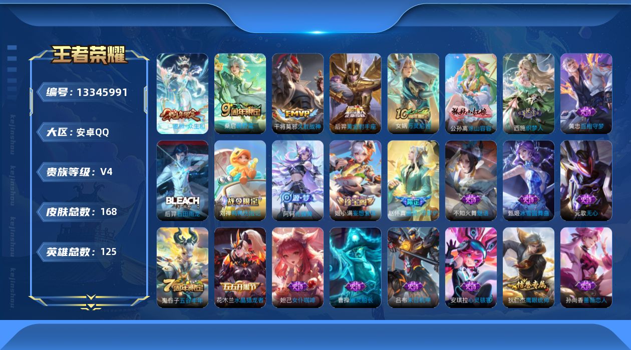 [13345991]【店主推荐捡漏号!可直接换绑】安卓Q-V4-最强王者段位-125英雄-168皮肤 -4传说-45史诗