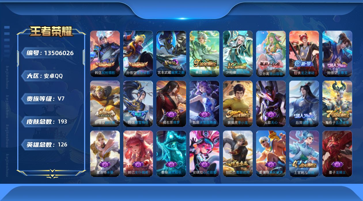 [13506026]【店主推荐捡漏号!可直接换绑】安卓Q-V7-最强王者段位-126英雄-193皮肤-2典藏-2传说-39史诗 【英雄全皮】:蒙恬全皮 【荣耀典藏】:孙悟空全息碎影,韩信弑枪猎影 【传说皮肤】:后羿神树通天,桑启鸣野蒿 【限定皮肤】:狄仁杰阴阳师,赵云皇家上将,嬴政优雅恋人,白起夜都怪侠,元歌无心,夏侯惇朔风刀,甄姬游园惊梦,狄仁杰魔术师,狄仁杰万华元夜,达摩沙漠行僧,项羽海滩派对,老夫子醍醐杖,程咬金演武夺筹,韩信傲雪梅枪,兰陵王金庭之子,孙悟空至尊宝,孙悟空孙行者,后羿如梦令,李元芳云中旅人,钟馗驱傩正仪,鬼谷子原初探秘者,鬼谷子五谷丰年,苏烈千军破阵,弈星混沌棋,沈梦溪大漠名商,明世隐疑决卦,明世隐吟游魔法,裴擒虎李小龙,裴擒虎擒涛扼浪,上官婉儿梁祝,西施玲珑珍味,鲁班大师探海日志,桑启海盐诗旅,艾琳女武神,阿古朵江河有灵,张良古海寻踪,蒙恬荣光圣徽,鬼谷子天穹祈灯,刘邦剑破天穹,程咬金群星魔术团 【赛季限定】:夏侯惇朔风刀,狄仁杰万华元夜,达摩沙漠行僧,老夫子醍醐杖,程咬金演武夺筹,兰陵王金庭之子,张良古海寻踪,李元芳云中旅人,钟馗驱傩正仪,鬼谷子原初探秘者,苏烈千军破阵,弈星混沌棋,沈梦溪大漠名商,明世隐疑决卦,裴擒虎擒涛扼浪,鲁班大师探海日志,桑启海盐诗旅,鬼谷子天穹祈灯,蒙恬荣光圣徽,刘邦剑破天穹 【战令限定】:白起夜都怪侠,明世隐吟游魔法,西施玲珑珍味 【史诗皮肤】:项羽苍穹之光,赵云皇家上将,甄姬冰雪圆舞曲,王昭君偶像歌手,狄仁杰魔术师,宫本武藏鬼剑武藏,孙尚香水果甜心,嬴政优雅恋人,嬴政暗夜贵公子,嬴政摇滚巨星,妲己魅力维加斯,妲己女仆咖啡,墨子龙骑士,墨子金属风暴,曹操幽灵船长,张飞乱世虎臣,孙悟空至尊宝,夏侯惇乘风破浪,甄姬游园惊梦,雅典娜冰冠公主,安琪拉心灵骇客,程咬金功夫厨神,阿轲节奏热浪,狄仁杰鹰眼统帅,上官婉儿梁祝,后羿如梦令,橘右京修罗,裴擒虎李小龙,孙悟空孙行者,韩信傲雪梅枪,夏洛特永昼,明世隐吟游魔法,鬼谷子五谷丰年,元歌无心,阿古朵江河有灵,蒙恬荣光圣徽,狂铁龙之律动,公孙离涂山容容,少司缘巫礼祀神 【其他皮肤】:项羽海滩派对,韩信教廷特使,韩信街头霸王,赵云白执事,赵云忍炎影,芈月红桃皇后,艾琳女武神,程咬金星际陆战队,白起白色死神,武则天东方不败,宫本武藏未来纪元,安琪拉玩偶对对碰,孙膑天使之翼,姜子牙时尚教父,妲己少女阿狸