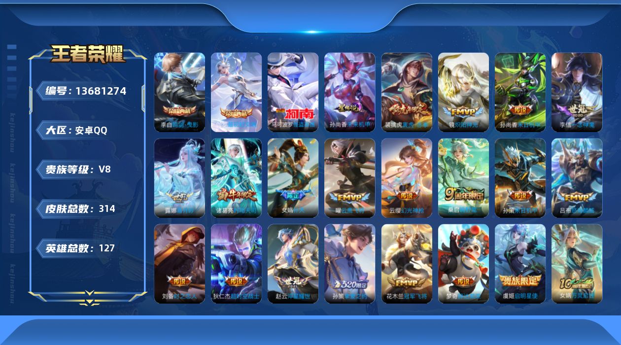 [13681274]可二次【店主推荐捡漏号!可直接换绑/对抗36】:安卓Q-V8-最强王者段位-127英雄-314皮肤-2典藏-1珍品传说-2星元-20传说-88史诗