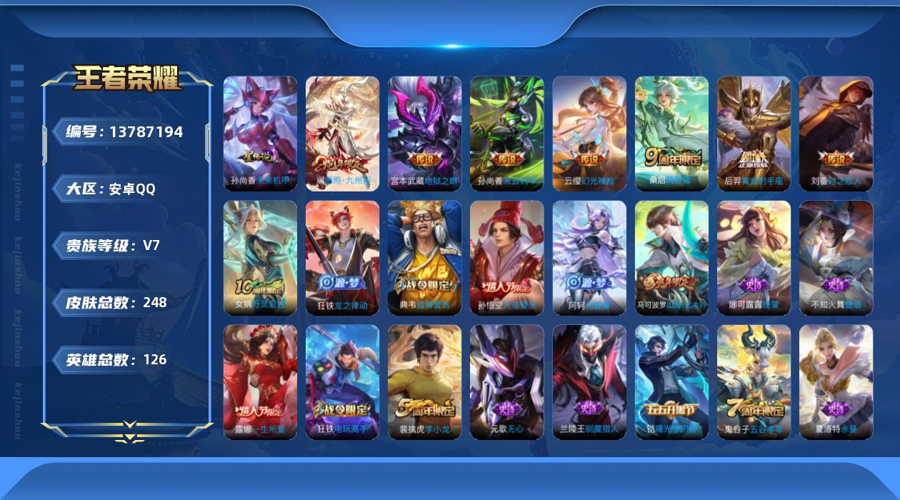- [12620838]安卓Q-V8-至尊星耀II段位-126英雄-357皮肤-1典藏-0珍品无双-0无双-0珍品传说-21传说-110史诗 【英雄全皮】:刘邦全皮,鬼谷子全皮,猪八戒全皮,蒙恬全皮,影全皮 【荣耀典藏】:武则天英雄,夏侯惇无限飓风号 【传说皮肤】:公孙离记忆之芯,不知火舞绯月行,王昭君星穹之声,大乔挚爱花嫁,孙策挚爱之约,孙尚香异界灵契,王昭君乞巧织情,西施游龙清影,曜李逍遥 ,兰陵王默契交锋,镜炽阳神光,虞姬启明星使,曜云鹰飞将,李信一念神魔,刘备时之恋人,伽罗太华,貂蝉猫影幻舞,虞姬云霓雀翎,百里玄策白虎志,杨戬永曜之星,武则天海洋之心 【限定皮肤】:白起狰,姜子牙天穹之誓,狄仁杰阴阳师,虞姬凯尔特女王,赵云皇家上将,赵云龙胆,墨子神迹守卫,嬴政优雅恋人,嬴政白昼王子,孙尚香异界灵契,鲁班七号狮舞东方,庄周蜃楼王,庄周云端筑梦师,庄周高山流水,高渐离死亡摇滚,阿轲迷踪丽影,钟无艳超时空战士,孙膑妖精王,孙膑天狼运算者,扁鹊炼金王,白起夜都怪侠,芈月重明,芈月白晶晶,芈月幻夜卜梦,吕布猎兽之王,周瑜赤莲之焰,元歌云间偶戏,元歌无心,夏侯惇朔风刀,甄姬女儿国国王,甄姬游园惊梦,甄姬落雪兰心,曹操烛龙,曹操天狼征服者,典韦穷奇,典韦蓝屏警告,马可波罗暗影游猎,狄仁杰魔术师,狄仁杰万华元夜,达摩星际陆战队,达摩沙漠行僧,项羽海滩派对,老夫子醍醐杖,老夫子航海奇遇记,程咬金演武夺筹,刘邦夺宝奇兵,韩信傲雪梅枪,王昭君午后时光,王昭君星穹之声,兰陵王默契交锋,兰陵王驯魔猎人,兰陵王金庭之子,花木兰青春决赛季,花木兰瑞麟志,花木兰默契交锋,不知火舞绯月行,亚瑟狮心王,亚瑟潮玩骑士王,孙悟空至尊宝,孙悟空大圣娶亲,孙悟空孙行者,牛魔御旌,后羿辉光之辰,后羿圣弓游侠,李元芳银河之约,李元芳云中旅人,虞姬启明星使,钟馗神迹守卫,钟馗驱傩正仪,杨玉环遇见飞天,杨戬永曜之星,女娲朔望之晖,干将莫邪真爱魔法,雅典娜单词大作战,雅典娜黎明之约,蔡文姬繁星吟游,太乙真人饕餮,太乙真人华丽摇滚,鬼谷子原初探秘者,鬼谷子五谷丰年,大乔白鹤梁神女,大乔挚爱花嫁,黄忠火炮绅士,苏烈千军破阵,百里玄策白虎志,百里玄策原初追逐者,弈星混沌棋,梦奇顽趣,沈梦溪星空之诺,沈梦溪大漠名商,明世隐疑决卦,明世隐吟游魔法,裴擒虎天狼狩猎者,裴擒虎李小龙,裴擒虎擒涛扼浪,狂铁御狮,狂铁电玩高手,米莱狄御霄,米莱狄胡桃异