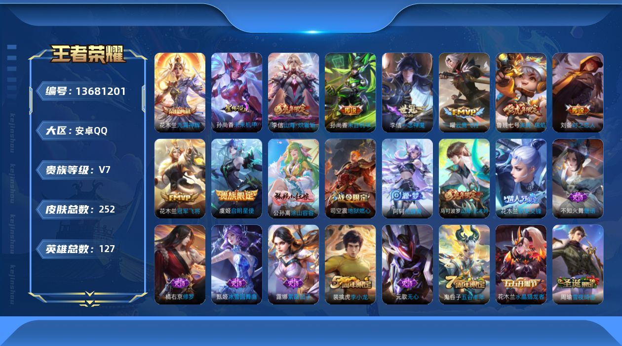 [13681201]【店主推荐捡漏号!可直接换绑】安卓Q-V7-永恒钻石III段位-127英雄-252皮肤-1典藏-8传说-60史诗 【英雄全皮】:李信全皮,蒙恬全皮 【荣耀典藏】:花木兰九霄神辉 【传说皮肤】:李信山海炽霜斩,鲁班七号寅虎瑞焰,虞姬启明星使,曜云鹰飞将,李信一念神魔,刘备时之恋人,花木兰冠军飞将,孙尚香末日机甲 【限定皮肤】:杨戬破阵退雄兵,狄仁杰阴阳师,赵云皇家上将,墨子神迹守卫,嬴政优雅恋人,嬴政白昼王子,孙尚香蔷薇恋人,鲁班七号寅虎瑞焰,庄周高山流水,高渐离玩趣恶龙,钟无艳超时空战士,芈月幻夜卜梦,元歌无心,甄姬游园惊梦,甄姬落雪兰心,马可波罗山海玄木吟,狄仁杰魔术师,狄仁杰万华元夜,达摩星际陆战队,达摩沙漠行僧,项羽海滩派对,老夫子醍醐杖,程咬金演武夺筹,兰陵王金庭之子,花木兰默契交锋,李元芳云中旅人,虞姬启明星使,钟馗驱傩正仪,雅典娜黎明之约,太乙真人华丽摇滚,鬼谷子原初探秘者,鬼谷子五谷丰年,黄忠火炮绅士,苏烈千军破阵,弈星混沌棋,梦奇顽趣,沈梦溪大漠名商,明世隐疑决卦,裴擒虎李小龙,裴擒虎擒涛扼浪,米莱狄胡桃异想国,云中君纤云弄巧,李信山海炽霜斩,上官婉儿梁祝,嫦娥拒霜思,嫦娥暖冬兔眠,西施玲珑珍味,鲁班大师探海日志,桑启海盐诗旅,暃星界游侠,戈娅驭风魔法,艾琳流音漫舞,司空震地狱燃心,阿古朵江河有灵,张良古海寻踪,蒙犽百解令,蒙恬荣光圣徽,高渐离燃音魔法,妲己灵卜魔法,鬼谷子天穹祈灯,沈梦溪龙舞盛年,鲁班七号蔬乡物语,李元芳蔬乡物语,刘邦剑破天穹,程咬金群星魔术团,镜青焰无极,项羽苍威无极,刘备异域游侠,周瑜熔金海岸 【年限皮肤】:鲁班七号寅虎瑞焰,马可波罗山海玄木吟,李信山海炽霜斩 【赛季限定】:狄仁杰万华元夜,达摩沙漠行僧,老夫子醍醐杖,程咬金演武夺筹,兰陵王金庭之子,张良古海寻踪,李元芳云中旅人,钟馗驱傩正仪,雅典娜黎明之约,鬼谷子原初探秘者,苏烈千军破阵,弈星混沌棋,梦奇顽趣,沈梦溪大漠名商,明世隐疑决卦,裴擒虎擒涛扼浪,鲁班大师探海日志,桑启海盐诗旅,鬼谷子天穹祈灯,蒙恬荣光圣徽,刘邦剑破天穹 【战令限定】:墨子神迹守卫,嬴政白昼王子,钟无艳超时空战士,芈月幻夜卜梦,甄姬落雪兰心,达摩星际陆战队,艾琳流音漫舞,黄忠火炮绅士,米莱狄胡桃异想国,嫦娥暖冬兔眠,西施玲珑珍味,司空震地狱燃心,暃星界游侠,戈娅驭风魔法,高渐离燃音魔法,妲己灵卜魔法,
