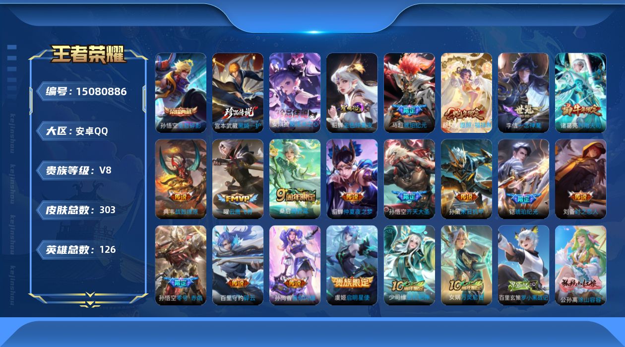 [15080886]【店主推荐捡漏号!可直接换绑】安卓Q-V8-最强王者段位-126英雄-303皮肤-1典藏-0珍品无双-0无双-2珍品传说-17传说-86史诗 【英雄全皮】:刘禅全皮,孙权全皮,空空儿全皮 【荣耀典藏】:孙悟空全息碎影 【珍品传说】:安琪拉酷洛米之心,宫本武藏黑崎一护 【传说皮肤】:后羿神树通天,蔡文姬愿照福禄聚,桑启鸣野蒿,典韦战鼓燎原,马超琥珀纪元,铠琥珀纪元,孙悟空齐天大圣,百里守约碎云,孙尚香音你闪耀,孙策末日机甲,诸葛亮时雨天司,虞姬启明星使,孙悟空零号赤焰,曜云鹰飞将,李信一念神魔,刘备时之恋人,貂蝉仲夏夜之梦 【限定皮肤】:暃埋骨钱,蔡文姬夏日便利店,虞姬夏日便利店,姜子牙天穹之誓,杨戬破阵退雄兵,李白谪仙醉月,狄仁杰阴阳师,赵云皇家上将,孙尚香蔷薇恋人,钟无艳超时空战士,元歌无心,甄姬落雪兰心,狄仁杰魔术师,达摩沙漠行僧,项羽海滩派对,王昭君午后时光,兰陵王金庭之子,亚瑟潮玩骑士王,孙悟空至尊宝,孙悟空大圣娶亲,孙悟空零号赤焰,孙悟空孙行者,孙悟空齐天大圣,李元芳银河之约,李元芳云中旅人,虞姬启明星使,杨戬潮玩骑兵,鬼谷子五谷丰年,诸葛亮时雨天司,苏烈千军破阵,沈梦溪大漠名商,裴擒虎擒涛扼浪,狂铁电玩高手,云中君纤云弄巧,嫦娥暖冬兔眠,鲁班大师探海日志,桑启海盐诗旅,暃星界游侠,艾琳女武神,艾琳流音漫舞,司空震地狱燃心,阿古朵江河有灵,张良古海寻踪,蒙犽百解令,高渐离燃音魔法,妲己灵卜魔法,鬼谷子天穹祈灯,伽罗琥珀纪元,铠琥珀纪元,马超琥珀纪元,沈梦溪龙舞盛年,鲁班七号蔬乡物语,李元芳蔬乡物语,刘邦剑破天穹,程咬金群星魔术团,镜青焰无极,项羽苍威无极,刘备异域游侠,芈月浮光幕影,周瑜熔金海岸 【年限皮肤】:诸葛亮时雨天司 【赛季限定】:达摩沙漠行僧,兰陵王金庭之子,张良古海寻踪,李元芳云中旅人,苏烈千军破阵,沈梦溪大漠名商,裴擒虎擒涛扼浪,鲁班大师探海日志,桑启海盐诗旅,鬼谷子天穹祈灯,刘邦剑破天穹,姜子牙天穹之誓 【战令限定】:蔡文姬夏日便利店,虞姬夏日便利店,钟无艳超时空战士,甄姬落雪兰心,王昭君午后时光,艾琳流音漫舞,亚瑟潮玩骑士王,李元芳银河之约,杨戬潮玩骑兵,狂铁电玩高手,嫦娥暖冬兔眠,司空震地狱燃心,暃星界游侠,高渐离燃音魔法,妲己灵卜魔法,鲁班七号蔬乡物语,李元芳蔬乡物语,镜青焰无极,项羽苍威无极 【史诗皮肤】:鲁班七号电玩小子,项羽苍