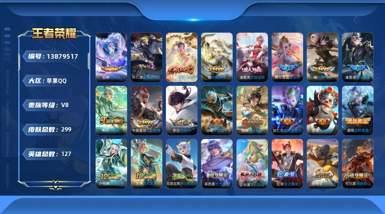[13879517]【店主推荐捡漏号!可直接换绑】苹果Q-V8-最强王者段位-127英雄-299皮肤-1典藏-0珍品无双-0无双-0珍品传说-15传说-105史诗