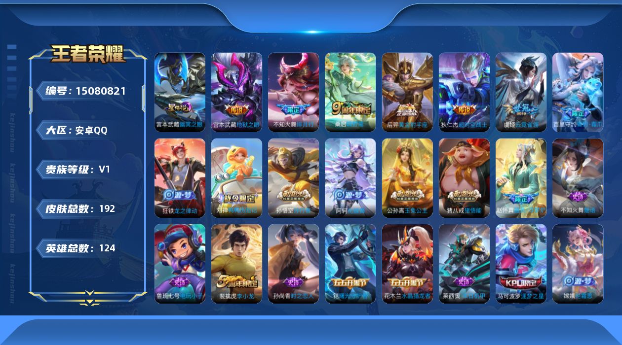 - [15146644]【店主推荐捡漏号!可直接换绑】安卓Q-V6-至尊星耀IV段位-127英雄-243皮肤-1典藏皮肤-1珍品传说-5传说-54史诗 【英雄全皮】:孙权全皮,狂铁全皮,空空儿全皮,影全皮 【荣耀典藏】:孙悟空全息碎影 【珍品传说】:宫本武藏黑崎一护 【传说皮肤】:桑启鸣野蒿,大乔挚爱花嫁,孙策挚爱之约,李信一念神魔,貂蝉仲夏夜之梦 【限定皮肤】:狄仁杰阴阳师,赵云皇家上将,墨子神迹守卫,孙尚香蔷薇恋人,庄周高山流水,高渐离玩趣恶龙,白起夜都怪侠,芈月幻夜卜梦,元歌云间偶戏,元歌无心,夏侯惇朔风刀,甄姬游园惊梦,狄仁杰魔术师,狄仁杰万华元夜,达摩星际陆战队,达摩沙漠行僧,项羽海滩派对,老夫子醍醐杖,老夫子航海奇遇记,程咬金演武夺筹,韩信傲雪梅枪,王昭君午后时光,兰陵王金庭之子,花木兰青春决赛季,亚瑟潮玩骑士王,牛魔御旌,后羿圣弓游侠,李元芳云中旅人,钟馗驱傩正仪,干将莫邪真爱魔法,鬼谷子原初探秘者,鬼谷子五谷丰年,大乔挚爱花嫁,黄忠火炮绅士,苏烈千军破阵,百里守约朱雀志,弈星混沌棋,沈梦溪大漠名商,明世隐疑决卦,明世隐吟游魔法,裴擒虎李小龙,裴擒虎擒涛扼浪,狂铁御狮,狂铁电玩高手,米莱狄御霄,米莱狄胡桃异想国,云中君纤云弄巧,盾山御銮,孙策挚爱之约,上官婉儿梁祝,嫦娥拒霜思,鲁班大师探海日志,桑启海盐诗旅,张良古海寻踪,蒙犽百解令,鬼谷子天穹祈灯,刘邦剑破天穹,程咬金群星魔术团,刘备异域游侠 【年限皮肤】:百里守约朱雀志 【赛季限定】:夏侯惇朔风刀,狄仁杰万华元夜,达摩沙漠行僧,老夫子醍醐杖,程咬金演武夺筹,兰陵王金庭之子,张良古海寻踪,牛魔御旌,李元芳云中旅人,钟馗驱傩正仪,鬼谷子原初探秘者,苏烈千军破阵,弈星混沌棋,沈梦溪大漠名商,明世隐疑决卦,裴擒虎擒涛扼浪,狂铁御狮,米莱狄御霄,盾山御銮,鲁班大师探海日志,桑启海盐诗旅,鬼谷子天穹祈灯,刘邦剑破天穹 【战令限定】:墨子神迹守卫,白起夜都怪侠,芈月幻夜卜梦,元歌云间偶戏,达摩星际陆战队,老夫子航海奇遇记,王昭君午后时光,亚瑟潮玩骑士王,后羿圣弓游侠,干将莫邪真爱魔法,黄忠火炮绅士,明世隐吟游魔法,狂铁电玩高手,米莱狄胡桃异想国 【史诗皮肤】:鲁班七号电玩小子,项羽苍穹之光,赵云皇家上将,狄仁杰魔术师,宫本武藏鬼剑武藏,孙尚香蔷薇恋人,孙尚香水果甜心,嬴政暗夜贵公子,妲己魅力维加斯,妲己女仆咖啡,墨子龙骑士,韩信白龙吟
