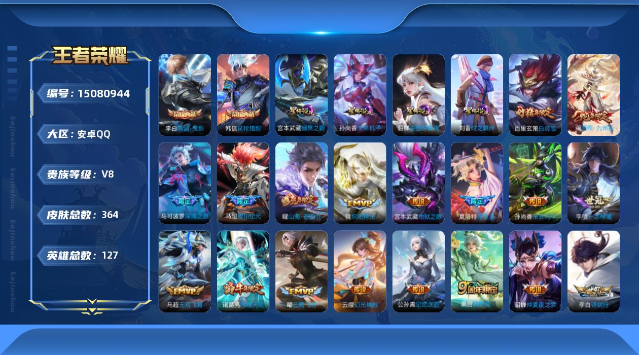 [15080944]【店主推荐捡漏号!可直接换绑/41段打野/七千四市50韩信、孙悟空/六千市50李白】:安卓Q-V8-最强王者段位-127英雄-364皮肤-2典藏-4星元-24传说-100史诗 【英雄全皮】:孙权全皮,鬼谷子全皮,狂铁全皮,马超全皮,蒙恬全皮,空空儿全皮,影全皮 【荣耀典藏】:李白鸣剑曳影,韩信弑枪猎影 【传说皮肤】:后羿神树通天,澜愿照九州拓,云缨幻光神枪,桑启鸣野蒿,马超琥珀纪元,公孙离记忆之芯,夏洛特浮生妄,曜山海苍雷引,李白诗剑行,马可波罗深海之息,马超无双飞将,诸葛亮时雨天司,镜炽阳神光,虞姬启明星使,孙悟空零号赤焰,曜云鹰飞将,李信一念神魔,刘备时之恋人,张良黄金白羊座,百里玄策白虎志,花木兰冠军飞将,貂蝉仲夏夜之梦,孙尚香末日机甲,宫本武藏地狱之眼 【限定皮肤】:蔡文姬夏日便利店,虞姬夏日便利店,姜子牙天穹之誓,李白谪仙醉月,狄仁杰阴阳师,赵云皇家上将,孙尚香蔷薇恋人,高渐离死亡摇滚,高渐离玩趣恶龙,阿轲迷踪丽影,白起夜都怪侠,芈月重明,芈月幻夜卜梦,元歌云间偶戏,元歌无心,夏侯惇朔风刀,甄姬落雪兰心,典韦穷奇,马可波罗暗影游猎,马可波罗深海之息,狄仁杰魔术师,狄仁杰万华元夜,达摩沙漠行僧,项羽海滩派对,老夫子醍醐杖,程咬金演武夺筹,刘邦夺宝奇兵,韩信逐梦之影,韩信傲雪梅枪,王昭君午后时光,兰陵王驯魔猎人,兰陵王金庭之子,亚瑟潮玩骑士王,孙悟空至尊宝,孙悟空零号赤焰,牛魔御旌,李元芳银河之约,李元芳云中旅人,虞姬启明星使,钟馗驱傩正仪,杨玉环遇见飞天,女娲朔望之晖,干将莫邪冰霜恋舞曲,雅典娜单词大作战,雅典娜黎明之约,蔡文姬繁星吟游,鬼谷子原初探秘者,鬼谷子五谷丰年,诸葛亮时雨天司,铠青龙志,苏烈千军破阵,百里玄策白虎志,百里玄策原初追逐者,弈星混沌棋,梦奇顽趣,沈梦溪大漠名商,明世隐疑决卦,明世隐吟游魔法,裴擒虎李小龙,裴擒虎擒涛扼浪,狂铁御狮,狂铁电玩高手,米莱狄御霄,云中君纤云弄巧,盾山御銮,猪八戒西部大镖客,上官婉儿梁祝,嫦娥拒霜思,曜山海苍雷引,西施玲珑珍味,蒙犽狂想玩偶喵,鲁班大师探海日志,镜匿光追影者,桑启海盐诗旅,夏洛特浮生妄,戈娅驭风魔法,艾琳流音漫舞,司空震地狱燃心,阿古朵江河有灵,张良古海寻踪,蒙犽百解令,蒙恬荣光圣徽,鬼谷子天穹祈灯,伽罗琥珀纪元,马超琥珀纪元,姬小满妄想食味,沈梦溪龙舞盛年,鲁班七号蔬乡物语,李元芳蔬乡物语,刘