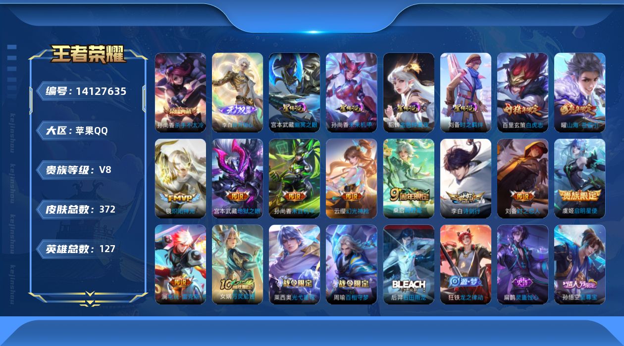 [14127635]【店主推荐捡漏号!可直接换绑/48段打野/万战阿珂】:苹果Q-V8-最强王者段位-127英雄-372皮肤-1典藏-1无双-4星元-12传说-108史诗 【英雄全皮】:孙权全皮,鬼谷子全皮,猪八戒全皮,蒙恬全皮,戈娅全皮,影全皮 【荣耀典藏】:孙尚香杀手不太冷 【无双皮肤】:李白碎月剑心 【传说皮肤】:后羿神树通天,云缨幻光神枪,桑启鸣野蒿,澜电玩雷克斯,曜山海苍雷引,李白诗剑行,镜炽阳神光,虞姬启明星使,刘备时之恋人,百里玄策白虎志,孙尚香末日机甲,宫本武藏地狱之眼 【限定皮肤】:姜子牙天穹之誓,狄仁杰阴阳师,赵云皇家上将,墨子神迹守卫,嬴政优雅恋人,嬴政白昼王子,鲁班七号狮舞东方,庄周高山流水,高渐离玩趣恶龙,阿轲迷踪丽影,钟无艳超时空战士,扁鹊奇幻香踪,芈月幻夜卜梦,吕布猎兽之王,吕布御风骁将,周瑜赤莲之焰,元歌云间偶戏,元歌无心,夏侯惇朔风刀,甄姬幽恒,甄姬落雪兰心,曹操天狼征服者,典韦岱宗,马可波罗暗影游猎,狄仁杰魔术师,狄仁杰万华元夜,达摩星际陆战队,达摩沙漠行僧,项羽海滩派对,老夫子醍醐杖,老夫子航海奇遇记,关羽冰锋战神,程咬金演武夺筹,刘邦夺宝奇兵,韩信飞衡,王昭君午后时光,兰陵王驯魔猎人,兰陵王金庭之子,花木兰默契交锋,亚瑟潮玩骑士王,孙悟空至尊宝,孙悟空孙行者,牛魔御旌,后羿辉光之辰,后羿圣弓游侠,李元芳银河之约,李元芳云中旅人,虞姬启明星使,钟馗神迹守卫,钟馗驱傩正仪,杨玉环遇见飞天,杨戬潮玩骑兵,干将莫邪真爱魔法,雅典娜单词大作战,雅典娜黎明之约,蔡文姬繁星吟游,太乙真人华丽摇滚,鬼谷子原初探秘者,鬼谷子五谷丰年,黄忠火炮绅士,苏烈千军破阵,百里玄策白虎志,百里玄策原初追逐者,弈星混沌棋,梦奇顽趣,沈梦溪星空之诺,沈梦溪大漠名商,明世隐疑决卦,裴擒虎李小龙,裴擒虎擒涛扼浪,狂铁电玩高手,米莱狄御霄,米莱狄胡桃异想国,云中君纤云弄巧,盾山御銮,猪八戒西部大镖客,猪八戒猪悟能,上官婉儿梁祝,嫦娥拒霜思,嫦娥暖冬兔眠,曜山海苍雷引,西施玲珑珍味,蒙犽狂想玩偶喵,鲁班大师探海日志,镜匿光追影者,桑启海盐诗旅,暃星界游侠,戈娅驭风魔法,艾琳女武神,阿古朵江河有灵,张良古海寻踪,蒙犽百解令,蒙恬荣光圣徽,高渐离燃音魔法,妲己灵卜魔法,鬼谷子天穹祈灯,李白碎月剑心,姬小满妄想食味,沈梦溪龙舞盛年,鲁班七号蔬乡物语,李元芳蔬乡物语,刘邦剑破天穹,镜青焰无极,