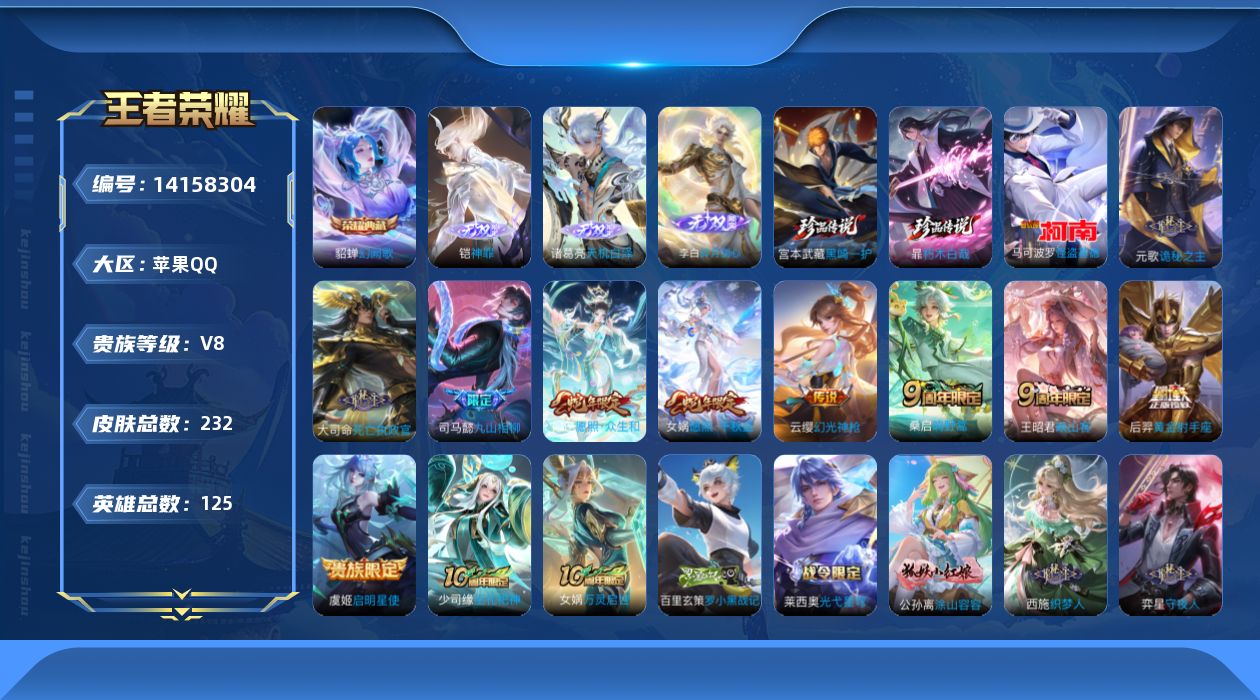 [14158304]【店主推荐捡漏号!可直接换绑/省50奕星】:苹果Q-V8-至尊星耀II段位-125英雄-232皮肤-1典藏-3无双-3珍品传说-13传说-70史诗