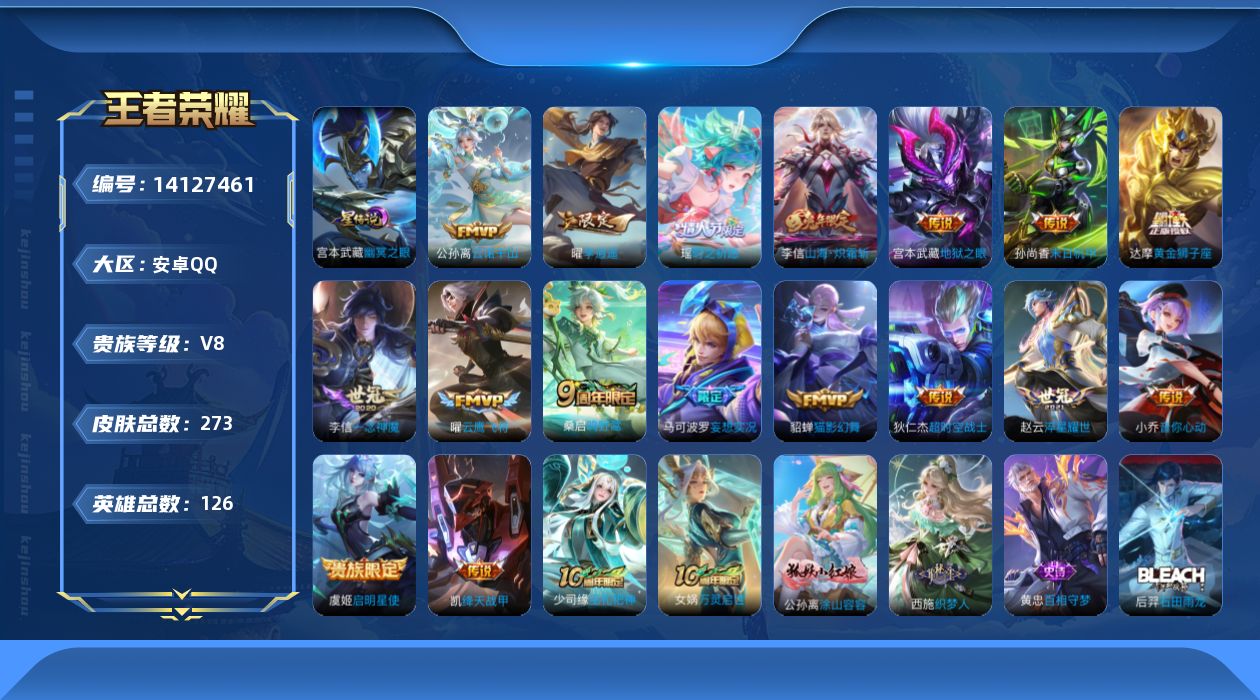 [14127461]【店主推荐捡漏号!可直接换绑】安卓Q-V8-最强王者段位-126英雄-273皮肤-17传说-87史诗