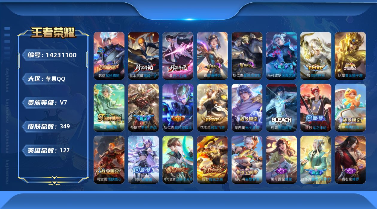 [14231100]【店主推荐捡漏号!可直接换绑】苹果Q-V7-最强王者段位-127英雄-349皮肤-1典藏皮肤-2珍品传说-7传说-91史诗 【英雄全皮】:钟馗全皮,太乙真人全皮,蒙恬全皮,戈娅全皮,影全皮 【荣耀典藏】:韩信弑枪猎影 【珍品传说】:暃朽木白哉,宫本武藏黑崎一护 【传说皮肤】:桑启鸣野蒿,马可波罗深海之息,镜炽阳神光,孙悟空零号赤焰,达摩黄金狮子座,花木兰冠军飞将,狄仁杰超时空战士 【限定皮肤】:白起狰,蒙犽顽岩魄,虞姬夏日便利店,姜子牙天穹之誓,杨戬破阵退雄兵,狄仁杰阴阳师,赵云皇家上将,赵云百木心枪,嬴政优雅恋人,嬴政白昼王子,鲁班七号狮舞东方,庄周高山流水,高渐离死亡摇滚,扁鹊奇幻香踪,芈月重明,元歌无心,夏侯惇朔风刀,甄姬游园惊梦,曹操烛龙,典韦穷奇,马可波罗深海之息,马可波罗山海玄木吟,狄仁杰魔术师,狄仁杰万华元夜,达摩沙漠行僧,项羽海滩派对,老夫子醍醐杖,程咬金演武夺筹,韩信逐梦之影,王昭君午后时光,兰陵王金庭之子,亚瑟潮玩骑士王,孙悟空零号赤焰,后羿辉光之辰,后羿圣弓游侠,李元芳云中旅人,钟馗神迹守卫,钟馗驱傩正仪,杨玉环遇见飞天,雅典娜单词大作战,雅典娜黎明之约,蔡文姬繁星吟游,太乙真人饕餮,太乙真人华丽摇滚,鬼谷子原初探秘者,鬼谷子五谷丰年,苏烈千军破阵,百里玄策原初追逐者,弈星混沌棋,梦奇顽趣,沈梦溪大漠名商,明世隐疑决卦,裴擒虎李小龙,裴擒虎擒涛扼浪,狂铁电玩高手,米莱狄御霄,云中君纤云弄巧,盾山御銮,上官婉儿梁祝,嫦娥拒霜思,西施玲珑珍味,蒙犽狂想玩偶喵,鲁班大师探海日志,桑启海盐诗旅,戈娅驭风魔法,艾琳女武神,艾琳流音漫舞,司空震地狱燃心,阿古朵江河有灵,张良古海寻踪,蒙犽百解令,蒙恬荣光圣徽,高渐离燃音魔法,妲己灵卜魔法,鬼谷子天穹祈灯,伽罗琥珀纪元,姬小满妄想食味,沈梦溪龙舞盛年,鲁班七号蔬乡物语,李元芳蔬乡物语,刘邦剑破天穹,程咬金群星魔术团,镜青焰无极,项羽苍威无极,刘备异域游侠,周瑜熔金海岸 【年限皮肤】:后羿辉光之辰,马可波罗山海玄木吟 【赛季限定】:白起狰,芈月重明,夏侯惇朔风刀,曹操烛龙,典韦穷奇,狄仁杰万华元夜,达摩沙漠行僧,老夫子醍醐杖,程咬金演武夺筹,兰陵王金庭之子,张良古海寻踪,李元芳云中旅人,钟馗驱傩正仪,雅典娜黎明之约,太乙真人饕餮,鬼谷子原初探秘者,苏烈千军破阵,百里玄策原初追逐者,弈星混沌棋,梦奇顽趣,沈梦溪