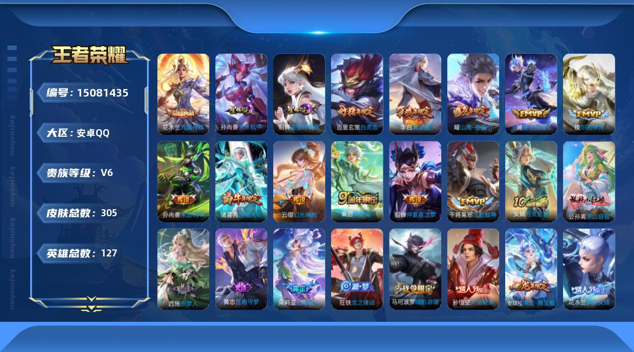 - [11295744]V8 1典藏 1无双 11传说 125英雄 272皮肤 可修改实名 安全保护中 荣耀水晶:鸣剑·曳影 无双皮:离恨烟(公孙离无双) 传说皮:乘龙·问璇玑(孙尚香年限),淬星耀世,云鹰飞将(小将军),飞鸢探春,绛天战甲(鸡嘴战神),超时空战士-狄仁杰,记忆之芯(机甲兔),澜逐花归海 珍宝阁皮:妄想食味,女武神 限定皮:逐霄战戟,鸣野蒿,至尊宝,神威(电光马子),遇见飞天,高山流水,诗剑行,朱雀志(守约年限),孙行者,玉兔公主,山海·玄木吟(马可年限) 史诗皮:器灵·浮梦炉,撼地雄心,谪仙醉月,龙之律动,百相守梦-百里守约,战舞者,蒙犽顽岩魄,芈月浮光幕影,怒海争锋,海诺心动手记,决胜骁骑,蔬乡物语(鲁班七号),琥珀纪元伽罗,破空之剑,紫霞仙子,电玩小子(小书包),白龙吟,黄金分割率,特工魅影,永昼,末日机甲-莱西奥,江河有灵,高渐离燃音魔法,雪夜绮愿(周瑜),百解令(蒙犽),冰冠公主,青蛇,偶像歌手,晚萤,无限星赏官,末日机甲-吕布,猫狗日记-孙策,乱世虎臣,节奏热浪,修罗,摇滚巨星,水果甜心,天才门将,星夜王子,心灵骇客,功夫厨神,德古拉伯爵,暗隐猎兽者,幽灵船长,鬼剑武藏,天秀·启明,地狱岩魂,纤云弄巧,拒霜思,月团寄思,水晶猎龙者,曙光守护者,金属风暴,原初追逐者,圣诞狂欢,圣诞恋歌,鹰眼统帅,暗夜贵公子,魅力维加斯,黎明之约,无心,未来纪元-赵云
