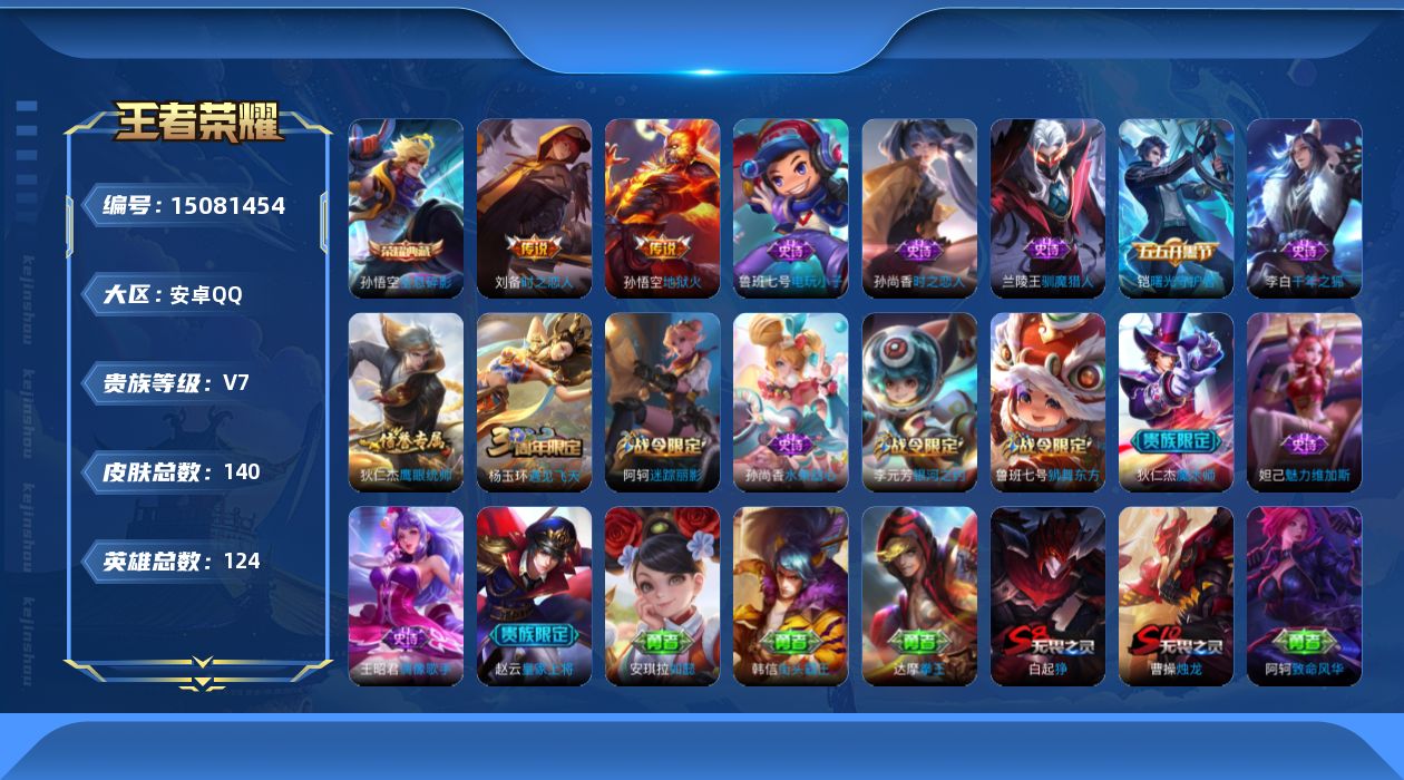 [15081454]【店主推荐捡漏号!可直接换绑】安卓Q-V7-最强王者段位-124英雄-140皮肤-1典藏皮肤-2传说-15史诗 【荣耀典藏】:孙悟空全息碎影 【传说皮肤】:刘备时之恋人,孙悟空地狱火 【限定皮肤】:白起狰,狄仁杰阴阳师,赵云皇家上将,鲁班七号狮舞东方,阿轲迷踪丽影,芈月重明,周瑜赤莲之焰,夏侯惇朔风刀,曹操烛龙,典韦穷奇,狄仁杰魔术师,狄仁杰万华元夜,项羽海滩派对,老夫子醍醐杖,程咬金演武夺筹,刘邦夺宝奇兵,兰陵王驯魔猎人,牛魔御旌,李元芳银河之约,李元芳云中旅人,钟馗神迹守卫,钟馗驱傩正仪,杨玉环遇见飞天,太乙真人饕餮,鬼谷子原初探秘者,弈星混沌棋,沈梦溪星空之诺,沈梦溪大漠名商,明世隐疑决卦,裴擒虎擒涛扼浪,狂铁御狮,米莱狄御霄,盾山御銮,鲁班大师探海日志,桑启海盐诗旅,沈梦溪龙舞盛年,刘邦剑破天穹 【赛季限定】:白起狰,芈月重明,夏侯惇朔风刀,曹操烛龙,典韦穷奇,狄仁杰万华元夜,老夫子醍醐杖,程咬金演武夺筹,牛魔御旌,李元芳云中旅人,钟馗驱傩正仪,太乙真人饕餮,鬼谷子原初探秘者,弈星混沌棋,沈梦溪大漠名商,明世隐疑决卦,裴擒虎擒涛扼浪,狂铁御狮,米莱狄御霄,盾山御銮,鲁班大师探海日志,桑启海盐诗旅,刘邦剑破天穹 【战令限定】:鲁班七号狮舞东方,阿轲迷踪丽影,周瑜赤莲之焰,刘邦夺宝奇兵,兰陵王驯魔猎人,李元芳银河之约,钟馗神迹守卫,沈梦溪星空之诺 【史诗皮肤】:鲁班七号电玩小子,赵云皇家上将,王昭君偶像歌手,狄仁杰魔术师,孙尚香水果甜心,妲己魅力维加斯,李白千年之狐,铠曙光守护者,杨玉环遇见飞天,鲁班七号狮舞东方,狄仁杰鹰眼统帅,兰陵王驯魔猎人,李元芳银河之约,阿轲迷踪丽影,孙尚香时之恋人 【其他皮肤】:项羽海滩派对,韩信教廷特使,韩信街头霸王,露娜哥特玫瑰,阿轲致命风华,阿轲爱心护理,达摩大发明家,赵云白执事,赵云忍炎影,程咬金星际陆战队,白起白色死神,扁鹊化身博士,庄周鲤鱼之梦,安琪拉玩偶对对碰,妲己少女阿狸,亚瑟死亡骑士,达摩拳王,花木兰兔女郎,甄姬花好人间,刘备万事如意,宫本武藏万象初新,狄仁杰阴阳师,刘备纽约教父,刘备汉昭烈帝,关羽龙腾万里,白起狰,钟无艳海滩丽影,太乙真人饕餮,宫本武藏霸王丸,曹操烛龙,芈月重明,狂铁命运角斗场,老夫子功夫老勺,孙尚香沉稳之力,典韦穷奇,诸葛亮掌控之力,李白敏锐之力,狂铁御狮,安琪拉如懿,苏烈坚韧之力,米莱狄御霄,明
