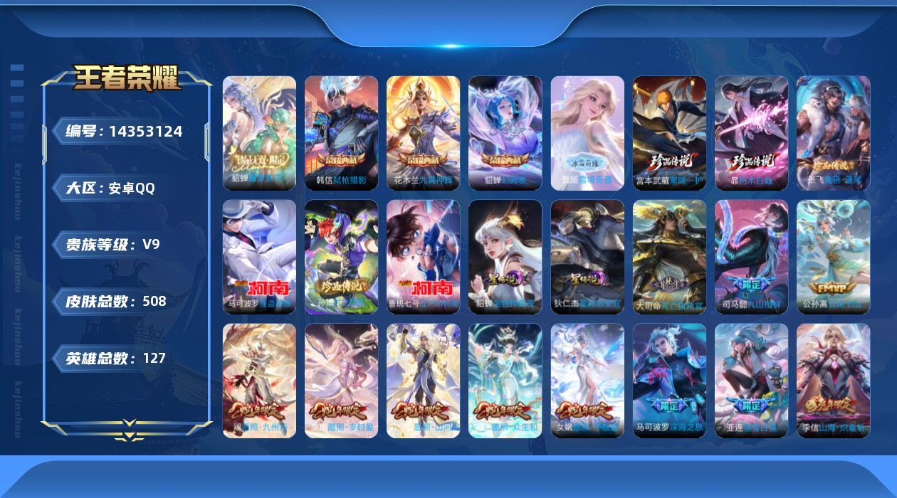 [14353124]可二次,【店主推荐捡漏号!可直接换绑】安卓Q-V9-最强王者段位-127英雄-508皮肤-3典藏皮肤-1珍品无双-1无双-6珍品传说-3星传说-51传说-166史诗