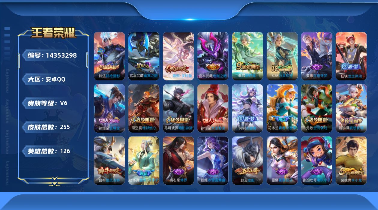 [14353298]【店主推荐捡漏号!可直接换绑】安卓Q-V6-最强王者段位-126英雄-255皮肤-1典藏皮肤-4传说-81史诗 【英雄全皮】:刘邦全皮,鬼谷子全皮,影全皮 【荣耀典藏】:韩信弑枪猎影 【传说皮肤】:后羿神树通天,虞姬愿照岁时盈,桑启鸣野蒿,宫本武藏地狱之眼 【限定皮肤】:姜子牙天穹之誓,杨戬破阵退雄兵,狄仁杰阴阳师,赵云皇家上将,赵云龙胆,墨子神迹守卫,嬴政优雅恋人,孙尚香蔷薇恋人,庄周高山流水,阿轲迷踪丽影,吕布御风骁将,元歌云间偶戏,元歌无心,夏侯惇朔风刀,甄姬游园惊梦,马可波罗暗影游猎,狄仁杰魔术师,狄仁杰万华元夜,达摩沙漠行僧,项羽海滩派对,老夫子醍醐杖,老夫子航海奇遇记,程咬金演武夺筹,刘邦夺宝奇兵,兰陵王金庭之子,花木兰青春决赛季,亚瑟潮玩骑士王,孙悟空至尊宝,孙悟空大圣娶亲,后羿如梦令,李元芳匿光侦查者,李元芳云中旅人,钟馗驱傩正仪,杨玉环遇见飞天,雅典娜单词大作战,蔡文姬繁星吟游,鬼谷子原初探秘者,鬼谷子五谷丰年,苏烈千军破阵,弈星混沌棋,沈梦溪大漠名商,明世隐疑决卦,裴擒虎李小龙,裴擒虎擒涛扼浪,云中君纤云弄巧,上官婉儿梁祝,嫦娥拒霜思,蒙犽狂想玩偶喵,鲁班大师探海日志,桑启海盐诗旅,艾琳流音漫舞,司空震地狱燃心,阿古朵江河有灵,张良古海寻踪,蒙犽百解令,鬼谷子天穹祈灯,伽罗琥珀纪元,姬小满妄想食味,沈梦溪龙舞盛年,鲁班七号蔬乡物语,李元芳蔬乡物语,刘邦剑破天穹,程咬金群星魔术团,镜青焰无极,项羽苍威无极,周瑜熔金海岸 【年限皮肤】:吕布御风骁将,赵云龙胆 【赛季限定】:夏侯惇朔风刀,狄仁杰万华元夜,达摩沙漠行僧,老夫子醍醐杖,程咬金演武夺筹,兰陵王金庭之子,张良古海寻踪,李元芳云中旅人,钟馗驱傩正仪,鬼谷子原初探秘者,苏烈千军破阵,弈星混沌棋,沈梦溪大漠名商,明世隐疑决卦,裴擒虎擒涛扼浪,鲁班大师探海日志,桑启海盐诗旅,鬼谷子天穹祈灯,刘邦剑破天穹,姜子牙天穹之誓 【战令限定】:墨子神迹守卫,阿轲迷踪丽影,元歌云间偶戏,马可波罗暗影游猎,老夫子航海奇遇记,刘邦夺宝奇兵,艾琳流音漫舞,亚瑟潮玩骑士王,雅典娜单词大作战,蒙犽狂想玩偶喵,司空震地狱燃心,鲁班七号蔬乡物语,李元芳蔬乡物语,镜青焰无极,项羽苍威无极 【史诗皮肤】:鲁班七号电玩小子,项羽苍穹之光,露娜紫霞仙子,赵云皇家上将,赵云未来纪元,貂蝉圣诞恋歌,甄姬冰雪圆舞曲,狄仁杰魔术师,廉颇地狱