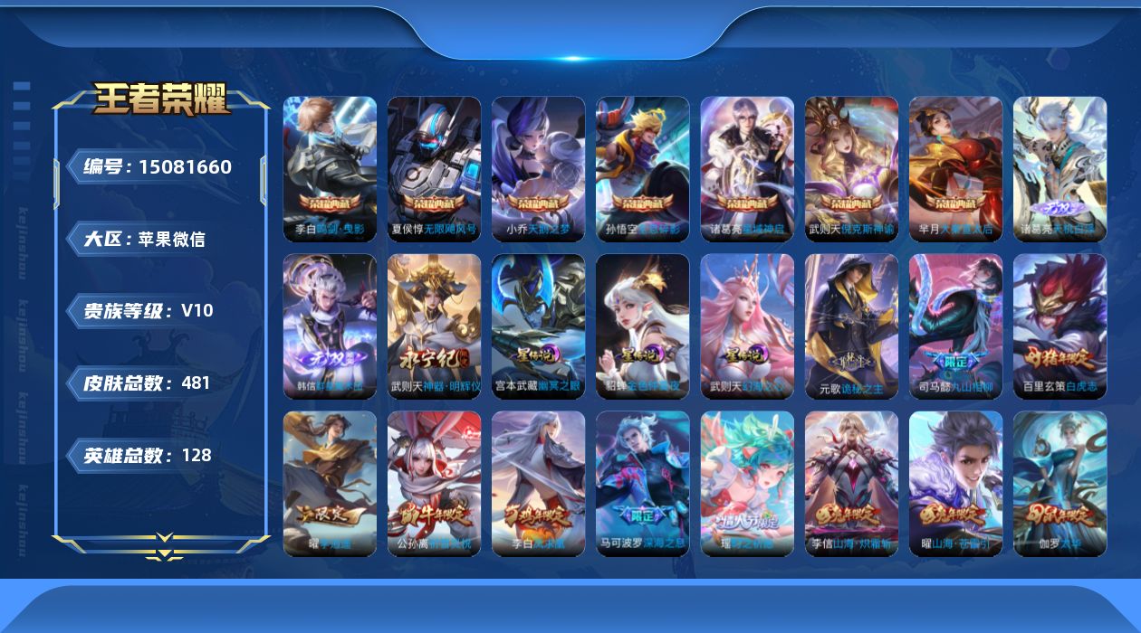 [15081660]苹果WX-V10-至尊星耀III段位-128英雄-481皮肤-7典藏皮肤-1典藏英雄-3无双-72传说-166史诗-4天幕-3星传说-武则天全皮! 【英雄全皮】:元歌全皮,司马懿全皮,娜可露露全皮,橘右京全皮,鬼谷子全皮,李信全皮,盾山全皮,鲁班大师全皮,蒙恬全皮,金蝉全皮,影全皮,少司缘全皮 【荣耀典藏】:武则天英雄,孙悟空全息碎影,武则天倪克斯神谕,夏侯惇无限飓风号,小乔天鹅之梦,芈月大秦宣太后,李白鸣剑曳影,诸葛亮星域神启 【无双皮肤】:武则天神器明辉仪,韩信群星魔术团,诸葛亮天机白泽 【传说皮肤】:后羿神树通天,元歌诡秘之主,司马懿九山相柳,桑启鸣野蒿,艾琳觅芳踪,澜电玩雷克斯,花木兰燃星之曲,虞姬无限倾心,项羽无限倾心,伽罗炽翼辉光,孙悟空齐天大圣,小乔山海琳琅生,曜山海苍雷引,李信山海炽霜斩,吕布怒海麟威,李白诗剑行,狄仁杰神器狴犴令,不知火舞绯月行,王昭君星穹之声,百里守约碎云,橘右京枫霜尽,娜可露露前尘镜,孙尚香音你闪耀,马可波罗深海之息,后羿无尽星芒,马超无双飞将,大乔挚爱花嫁,孙策挚爱之约,露娜启示之音,蔡文姬花朝如约,女娲补天,孙策末日机甲,瑶时之祈愿,孙尚香异界灵契,赵云淬星耀世,王昭君乞巧织情,西施游龙清影,曜李逍遥 ,周瑜音你心动,小乔音你心动,李元芳飞鸢探春,兰陵王默契交锋,公孙离祈雪灵祝,诸葛亮时雨天司,铠绛天战甲,镜炽阳神光,虞姬启明星使,孙悟空零号赤焰,关羽武圣,曜云鹰飞将,李信一念神魔,刘备时之恋人,伽罗太华,貂蝉猫影幻舞,张良黄金白羊座,干将莫邪久胜战神,虞姬云霓雀翎,达摩黄金狮子座,百里玄策白虎志,花木兰冠军飞将,梦奇胖达荣荣,后羿黄金射手座,杨戬永曜之星,诸葛亮武陵仙君,貂蝉仲夏夜之梦,李白凤求凰,孙尚香末日机甲,宫本武藏地狱之眼,孙悟空地狱火,吕布天魔缭乱,武则天海洋之心,狄仁杰超时空战士 【限定皮肤】:蔡文姬夏日便利店,虞姬夏日便利店,姜子牙天穹之誓,李白谪仙醉月,狄仁杰阴阳师,小乔山海琳琅生,赵云皇家上将,赵云龙胆,赵云百木心枪,墨子神迹守卫,墨子降魔,妲己热情桑巴,妲己时之彼端,妲己时之奇旅,嬴政优雅恋人,孙尚香蔷薇恋人,孙尚香异界灵契,庄周高山流水,高渐离玩趣恶龙,阿轲迷踪丽影,钟无艳超时空战士,扁鹊奇幻香踪,白起夜都怪侠,芈月白晶晶,芈月幻夜卜梦,吕布天魔缭乱,吕布猎兽之王,吕布御风骁将,周瑜赤莲之焰,元歌云