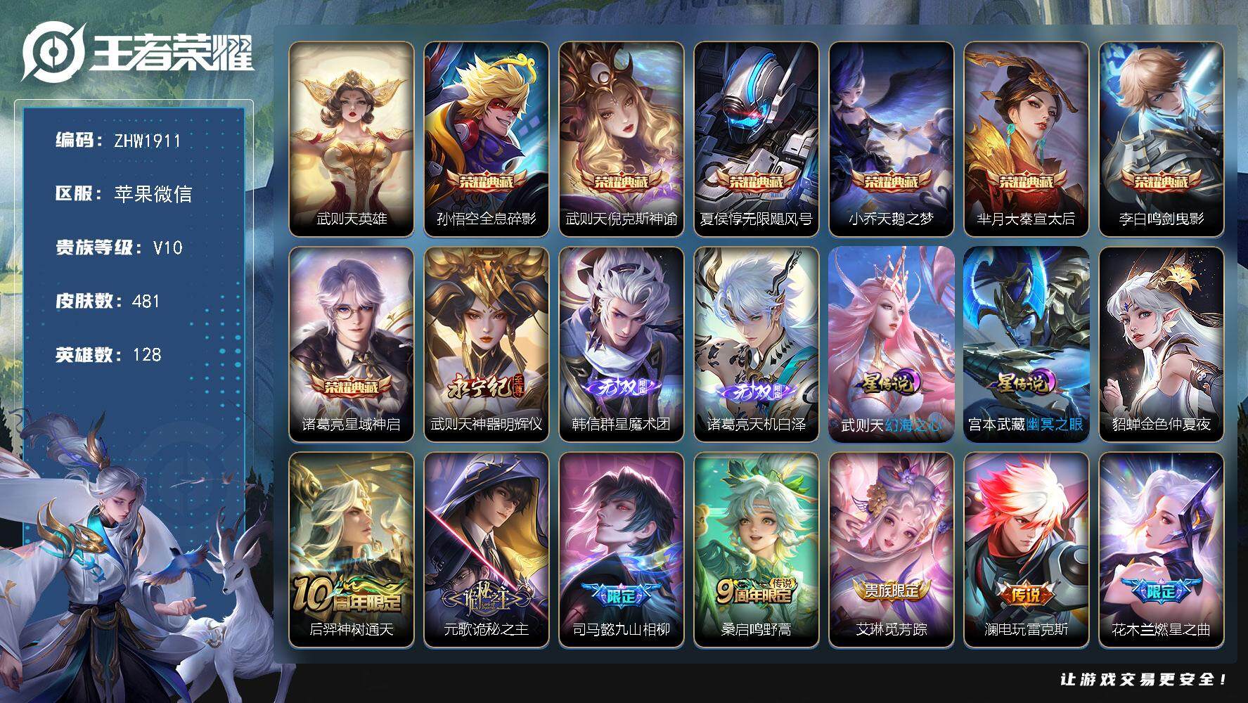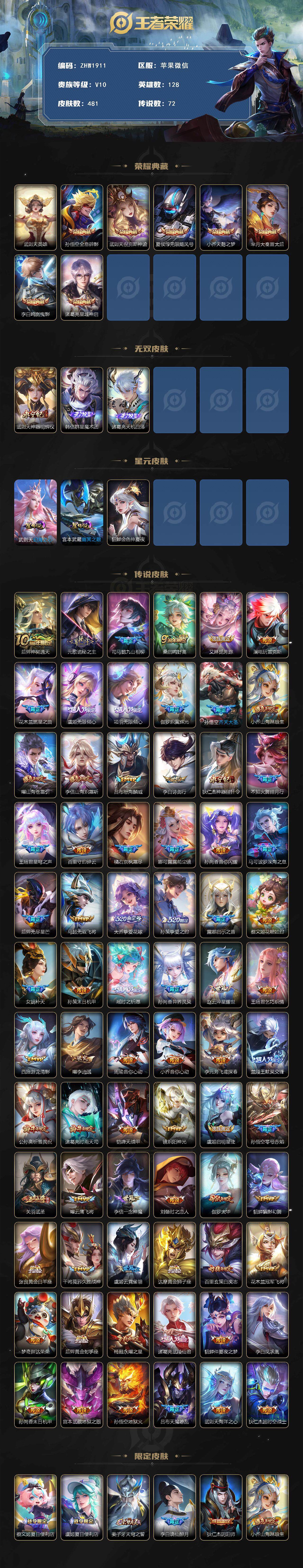 [15081660]苹果WX-V10-至尊星耀III段位-128英雄-481皮肤-7典藏皮肤-1典藏英雄-3无双-72传说-166史诗-4天幕-3星传说-武则天全皮!