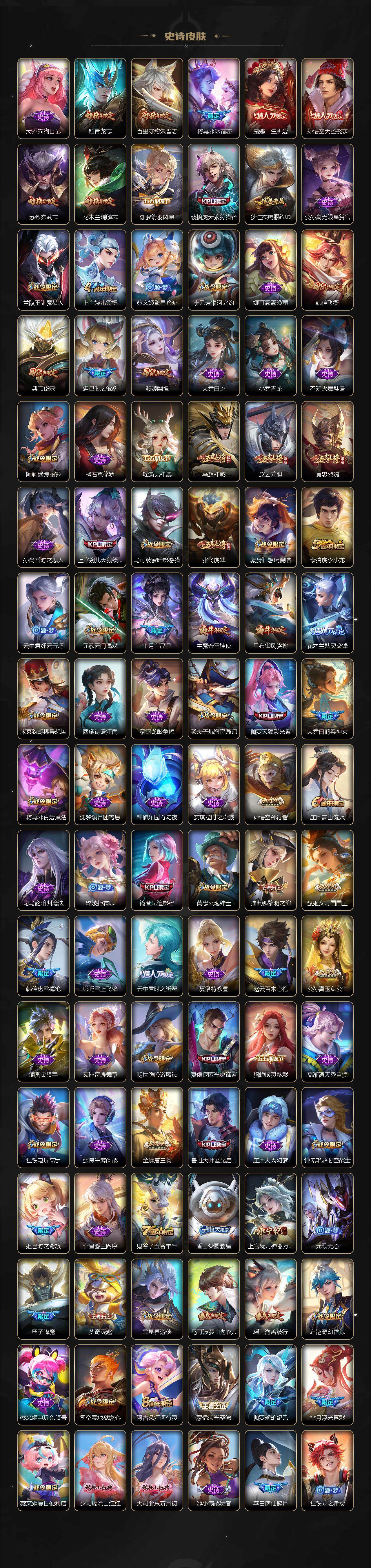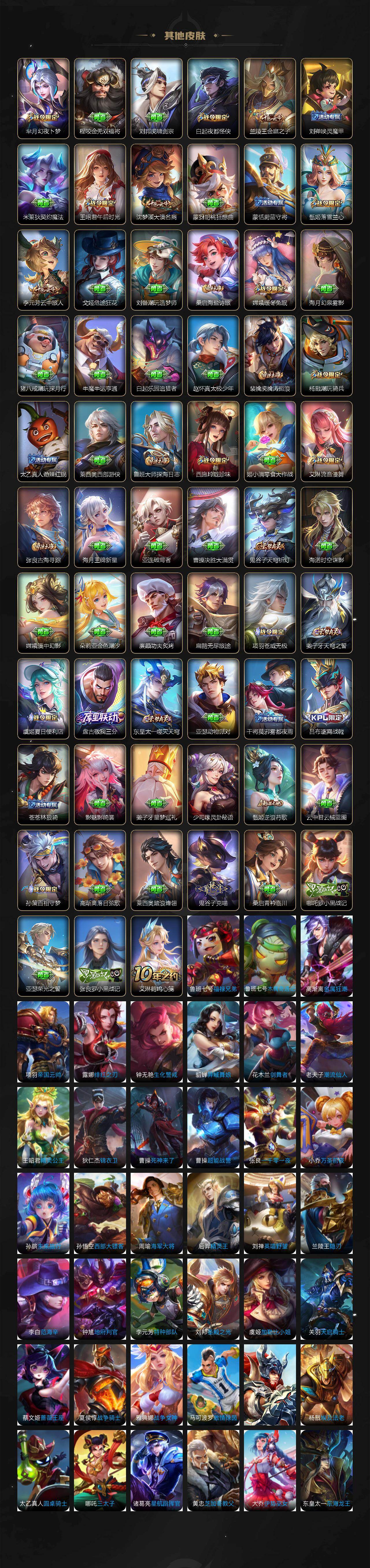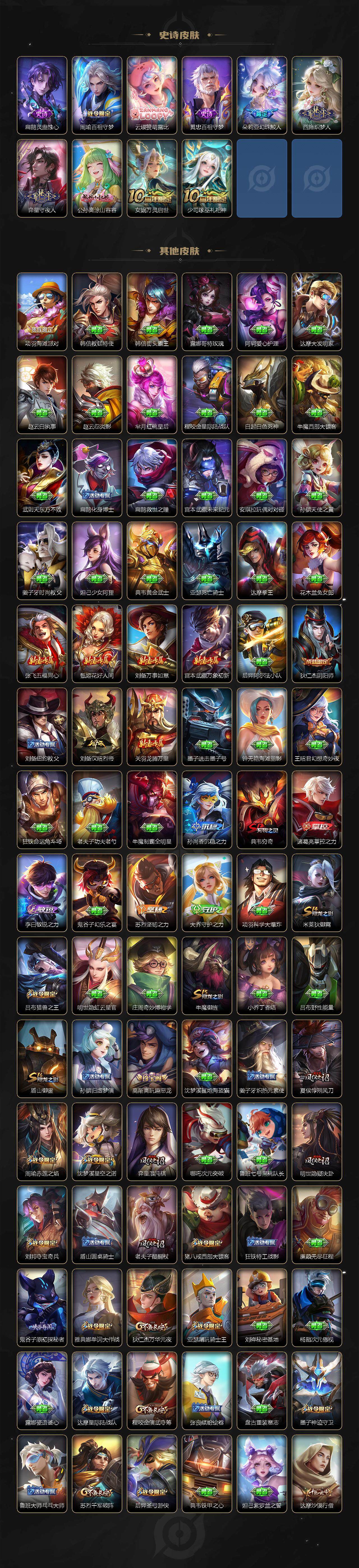 关羽冰锋战神,裴擒虎李小龙,上官婉儿梁祝,牛魔奔雷神使,公孙离祈雪灵祝,吕布御风骁将,诸葛亮时雨天司,赵云龙胆,关羽武圣,黄忠烈魂,张飞虎魄,马超神威,后羿辉光之辰,典韦岱宗,甄姬幽恒,韩信飞衡,伽罗太华,裴擒虎天狼狩猎者,上官婉儿天狼绘梦者,伽罗天狼溯光者,东皇太一逐梦之光,铠青龙志,百里玄策白虎志,花木兰瑞麟志,苏烈玄武志,百里守约朱雀志,王昭君凤凰于飞,孙悟空大圣娶亲,露娜一生所爱,花木兰默契交锋,兰陵王默契交锋,孙悟空至尊宝,妲己热情桑巴,干将莫邪冰霜恋舞曲,妲己时之彼端,芈月白晶晶,大乔白鹤梁神女,孙尚香异界灵契,孙悟空孙行者,甄姬女儿国国王,镜匿光追影者,韩信傲雪梅枪,云中君时之祈愿,瑶时之祈愿,女娲补天,赵云百木心枪,公孙离玉兔公主,露娜启示之音,夏侯惇匿光决锋者,后羿无尽星芒,马可波罗深海之息,金蝉唐三藏,娜可露露前尘镜,橘右京枫霜尽,鲁班大师匿光启智者,妲己时之奇旅,王昭君星穹之声,不知火舞绯月行,上官婉儿神器·万象笔,盾山梦圆繁星,墨子降魔,李白诗剑行,马可波罗山海·玄木吟,瑶山海·碧波行,桑启鸣野蒿