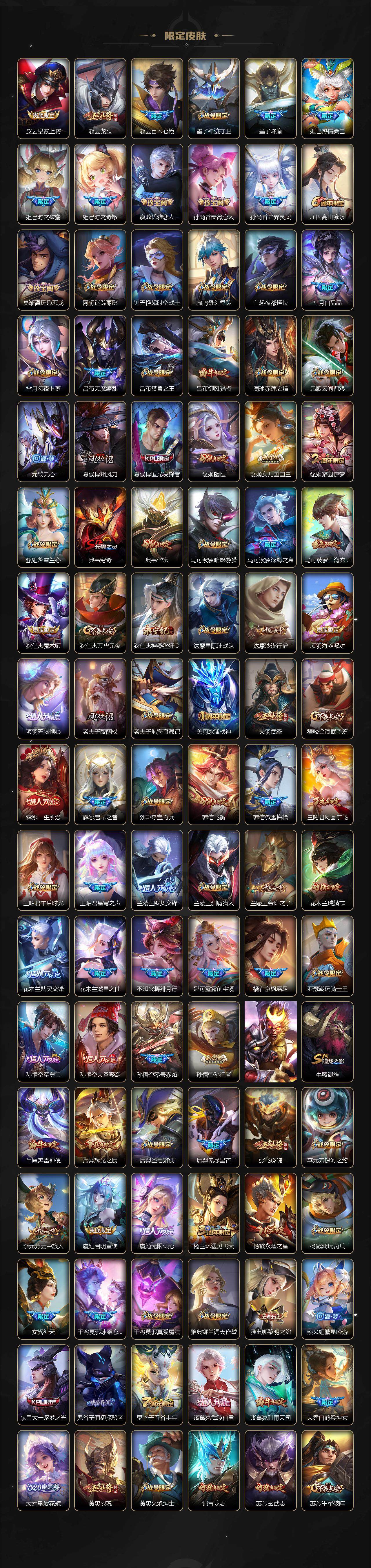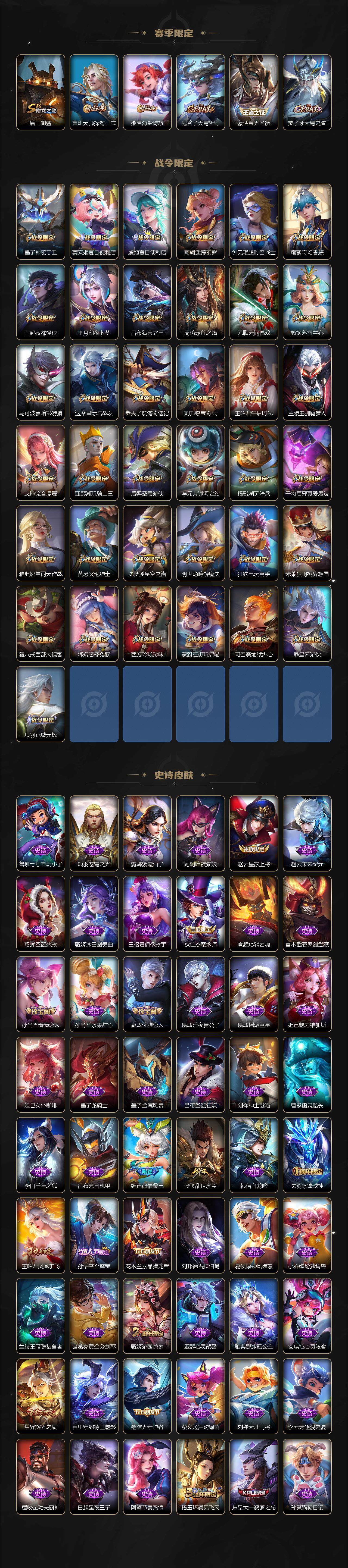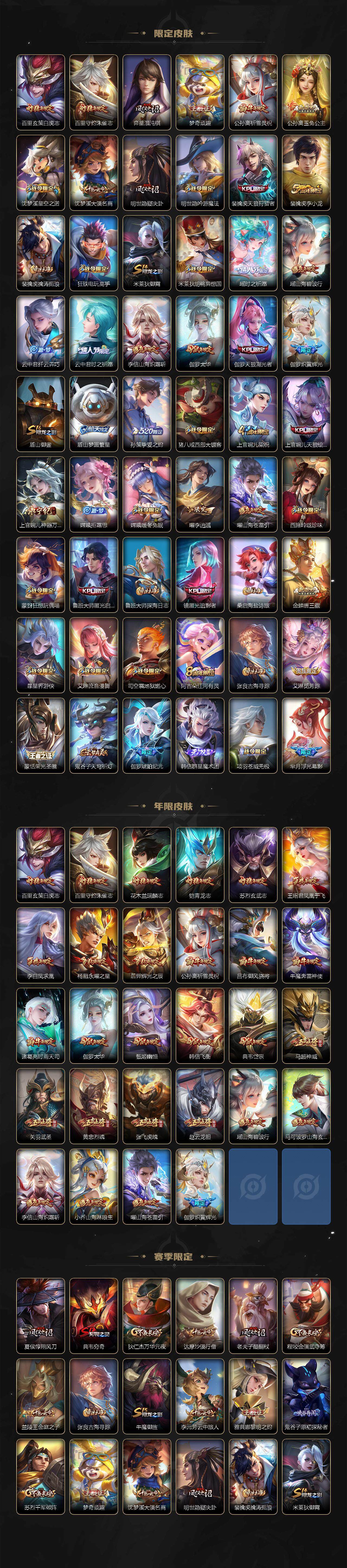 关羽冰锋战神,裴擒虎李小龙,上官婉儿梁祝,牛魔奔雷神使,公孙离祈雪灵祝,吕布御风骁将,诸葛亮时雨天司,赵云龙胆,关羽武圣,黄忠烈魂,张飞虎魄,马超神威,后羿辉光之辰,典韦岱宗,甄姬幽恒,韩信飞衡,伽罗太华,裴擒虎天狼狩猎者,上官婉儿天狼绘梦者,伽罗天狼溯光者,东皇太一逐梦之光,铠青龙志,百里玄策白虎志,花木兰瑞麟志,苏烈玄武志,百里守约朱雀志,王昭君凤凰于飞,孙悟空大圣娶亲,露娜一生所爱,花木兰默契交锋,兰陵王默契交锋,孙悟空至尊宝,妲己热情桑巴,干将莫邪冰霜恋舞曲,妲己时之彼端,芈月白晶晶,大乔白鹤梁神女,孙尚香异界灵契,孙悟空孙行者,甄姬女儿国国王,镜匿光追影者,韩信傲雪梅枪,云中君时之祈愿,瑶时之祈愿,女娲补天,赵云百木心枪,公孙离玉兔公主,露娜启示之音,夏侯惇匿光决锋者,后羿无尽星芒,马可波罗深海之息,金蝉唐三藏,娜可露露前尘镜,橘右京枫霜尽,鲁班大师匿光启智者,妲己时之奇旅,王昭君星穹之声,不知火舞绯月行,上官婉儿神器·万象笔,盾山梦圆繁星,墨子降魔,李白诗剑行,马可波罗山海·玄木吟,瑶山海·碧波行,桑启鸣野蒿