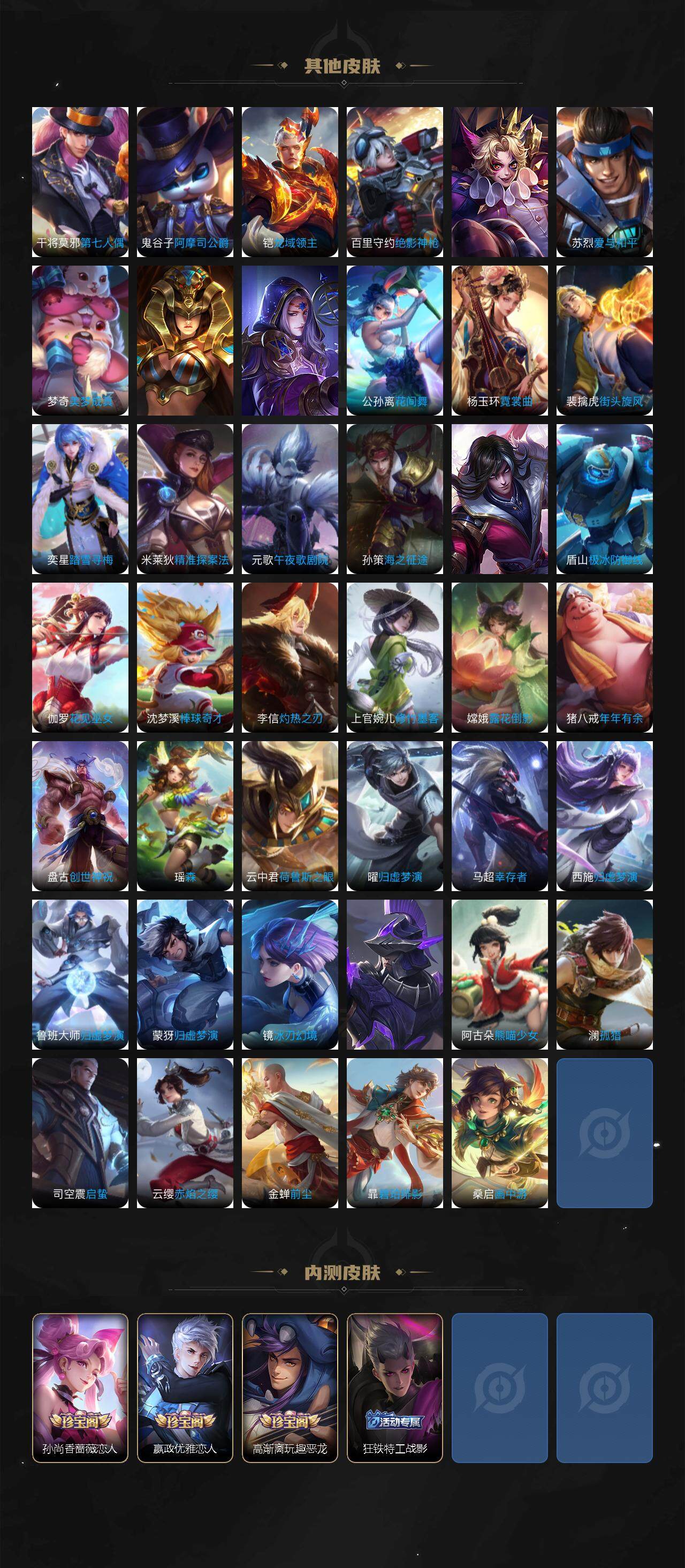 典韦穷奇,米莱狄御霄,牛魔御旌,盾山御銮,夏侯惇朔风刀,明世隐疑决卦,老夫子醍醐杖,鬼谷子原初探秘者,狄仁杰万华元夜,程咬金演武夺筹,苏烈千军破阵,吕布猎兽之王,沈梦溪星空之诺,李元芳银河之约,刘邦夺宝奇兵,马可波罗暗影游猎,蒙犽狂想玩偶喵,元歌云间偶戏,弈星混沌棋,达摩沙漠行僧,兰陵王金庭之子,沈梦溪大漠名商,李元芳云中旅人,桑启海盐诗旅,裴擒虎擒涛扼浪,鲁班大师探海日志,张良古海寻踪,项羽苍威无极