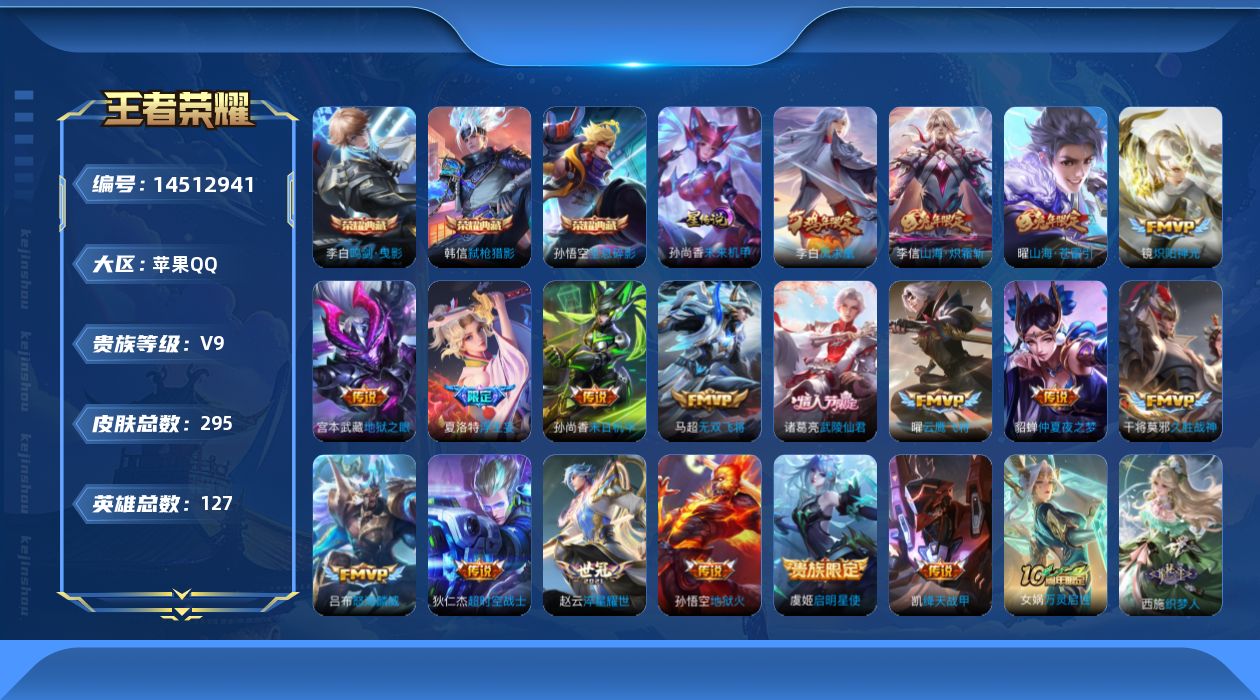 [14512941]【店主推荐捡漏号!可直接换绑】苹果Q-V9-最强王者段位-127英雄-295皮肤-3典藏皮肤-19传说-72史诗